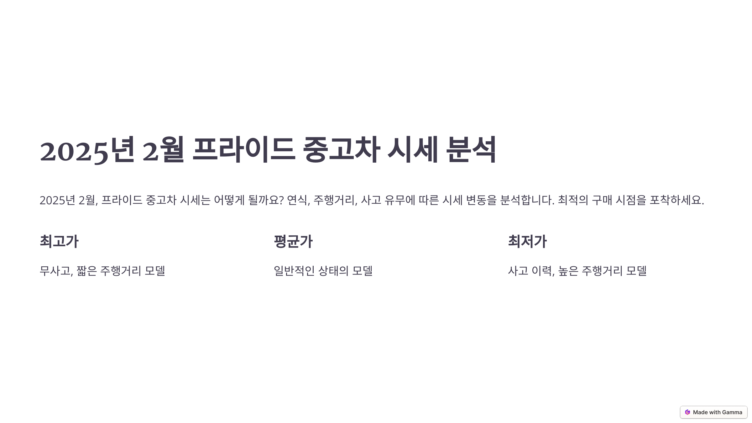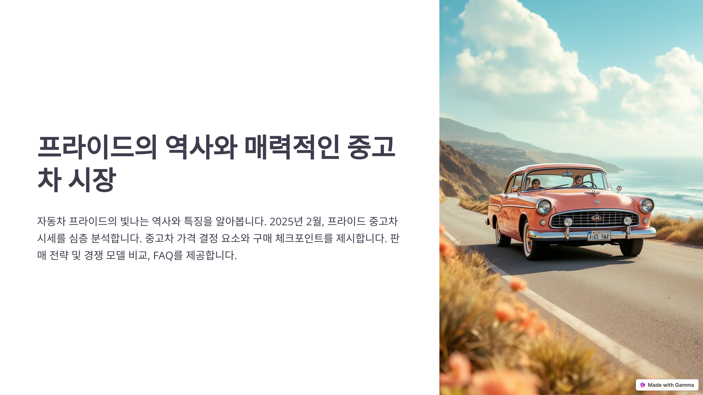 이번 글에서는 2025년 2월 기준 프라이드 중고차의 시세를 정리하고, 중고차 가격에 영향을 미치는 요소들을 살펴볼 거예요. 또한, 프라이드 중고차를 구매하거나 판매할 때 고려해야 할 사항들도 함께 알아볼게요.
