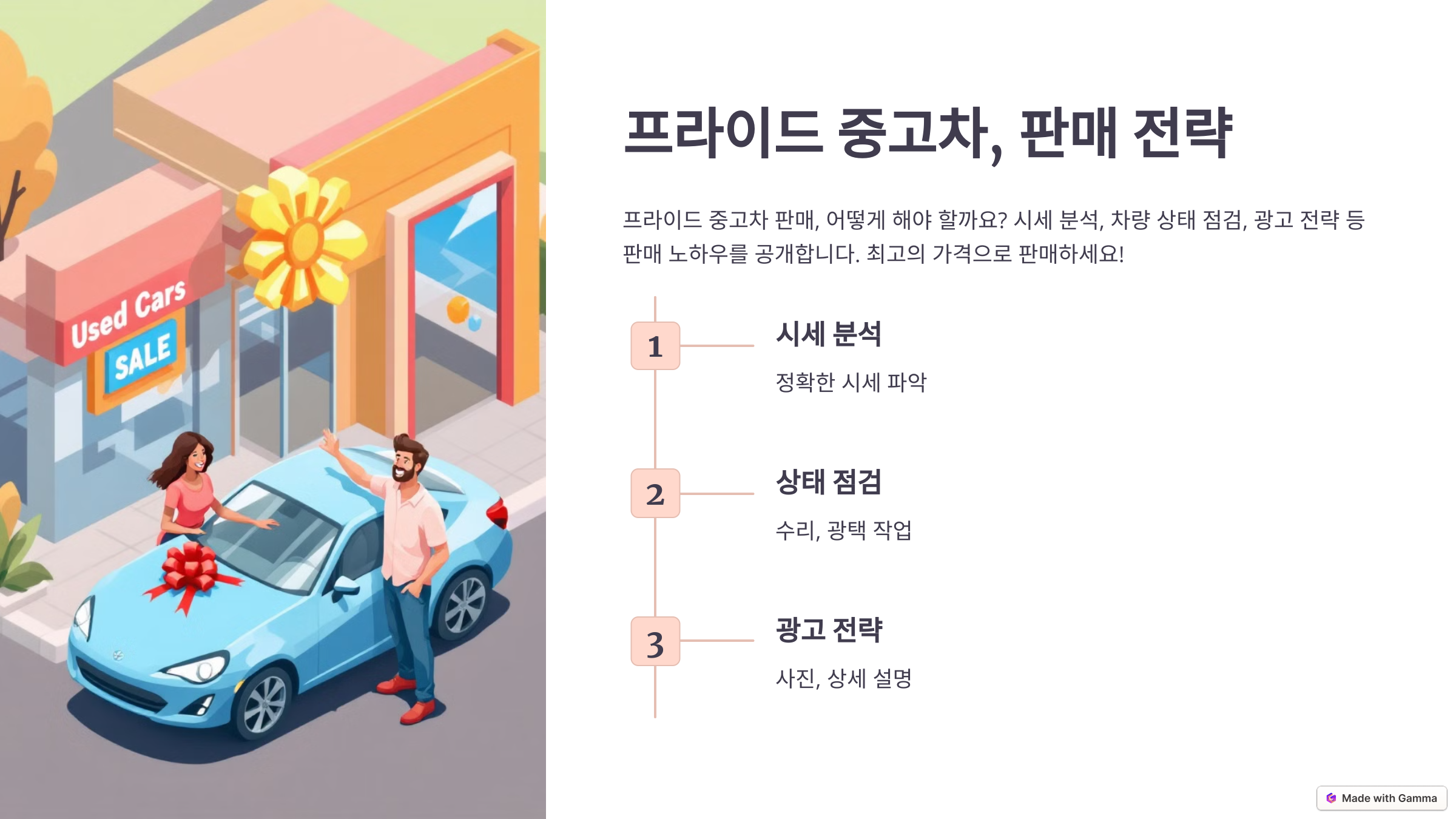 📌 1. 차량 정비 후 판매: 엔진오일 교체, 외관 세차 및 실내 청소를 통해 가치를 높일 수 있어요.