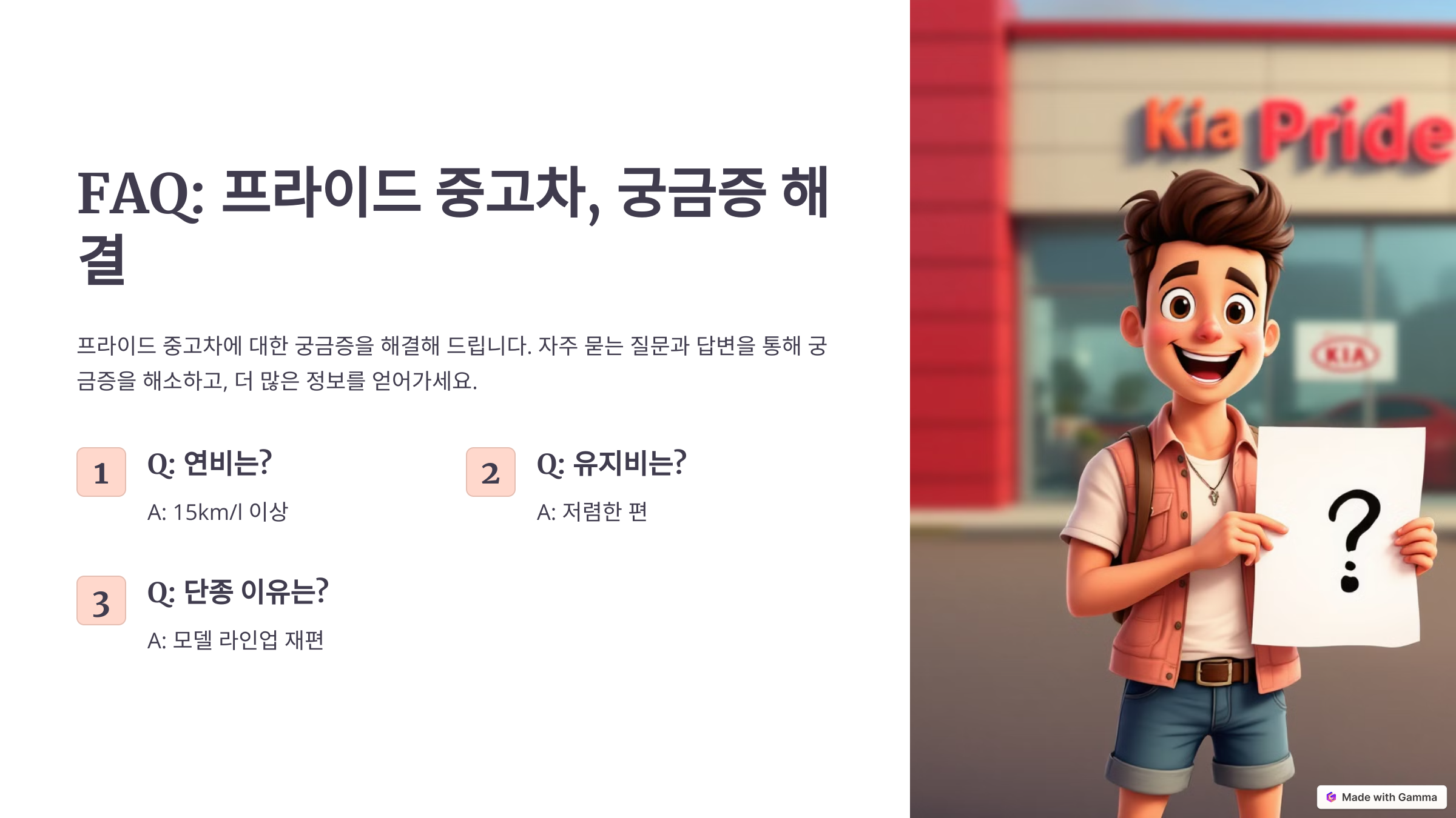 프라이드는 연비와 경제성이 뛰어나 중고차 시장에서도 여전히 인기가 높은 차량이에요. 시세를 잘 파악하고 꼼꼼한 점검을 거쳐 구매하면 만족도가 높을 거예요.