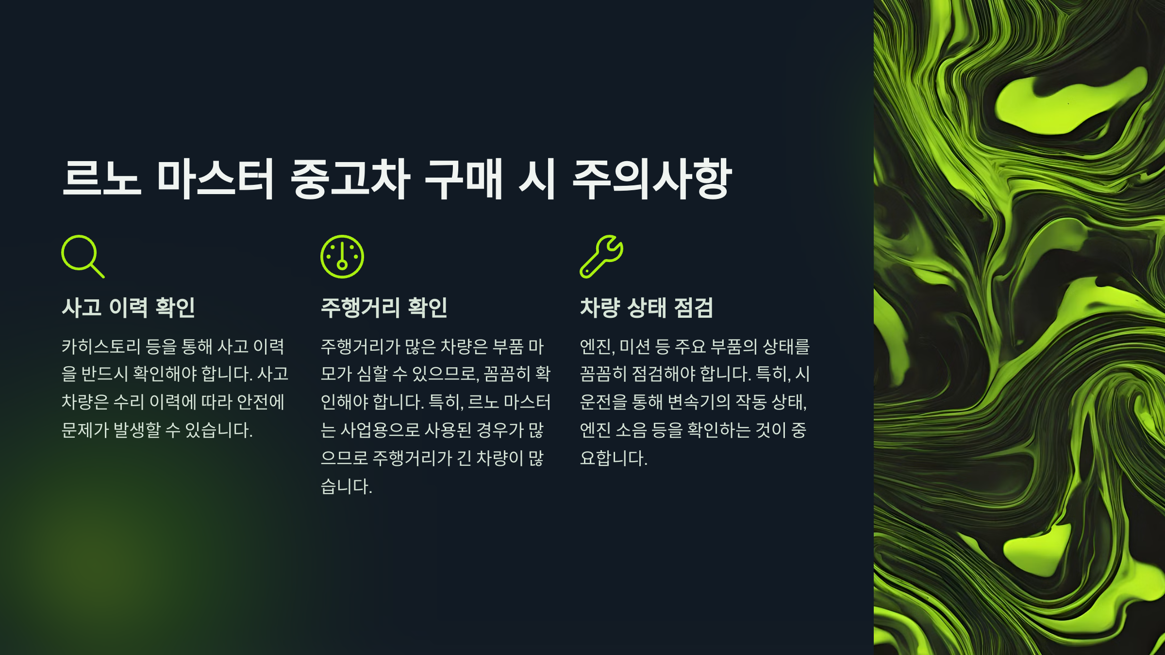 르노 마스터 중고차를 구매하기 전에 반드시 확인해야 할 사항들이 있습니다. 다음은 르노 마스터 중고차 구매 시 주의해야 할 점들입니다.