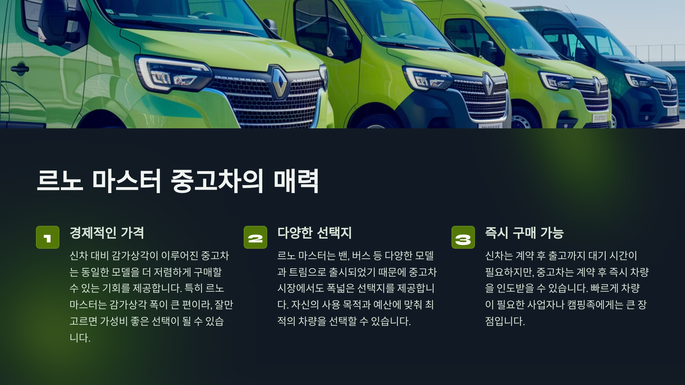 - 장점: 저렴한 가격으로 르노 마스터를 경험할 수 있다는 장점이 있습니다. 예산이 부족한 사업자나 개인에게 적합한 선택이 될 수 있습니다.
