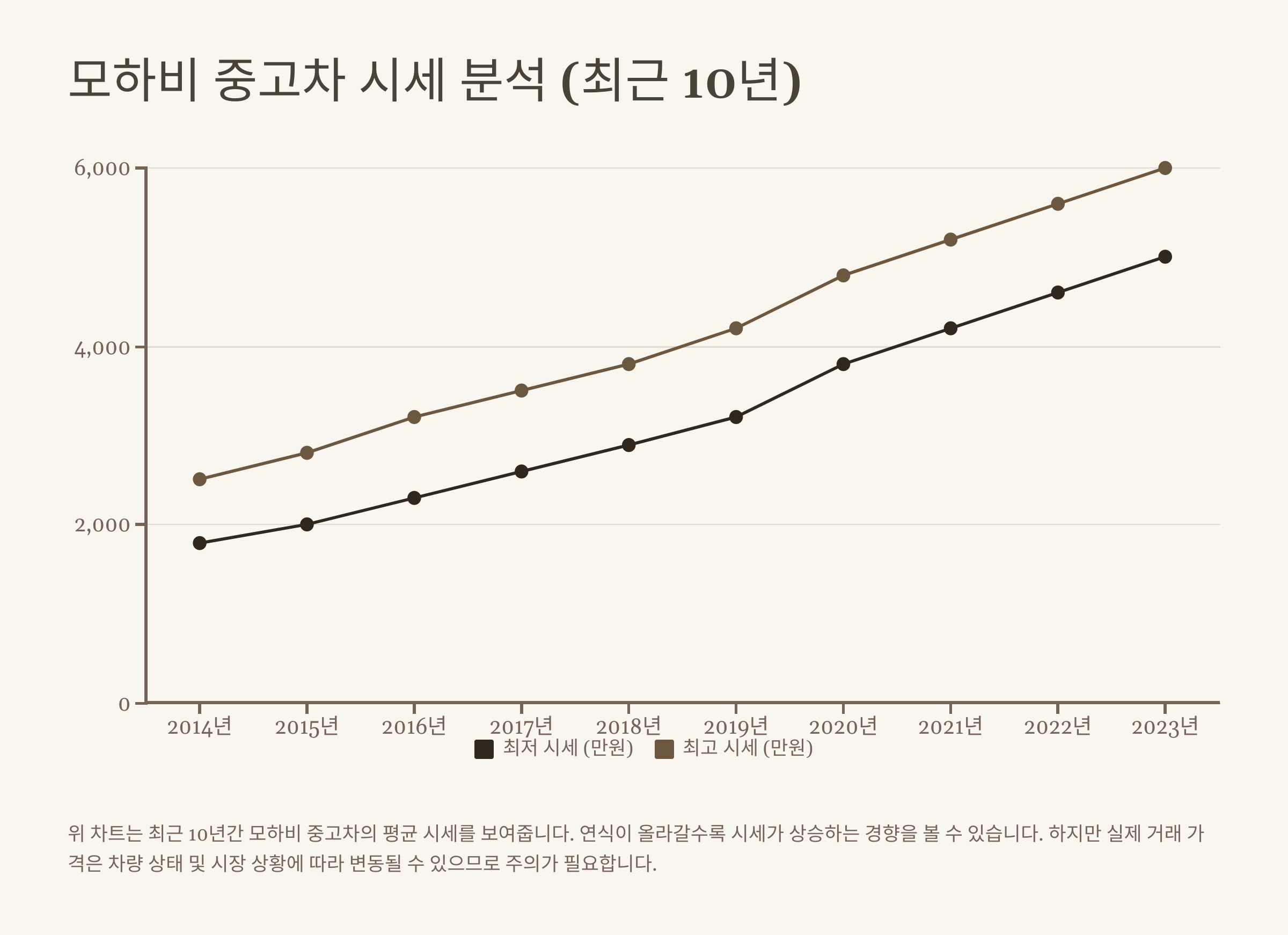 모하비 중고 시세는 연식, 모델, 트림, 주행거리, 사고 유무, 옵션 등 다양한 요인에 따라 결정됩니다. 아래 표는 최근 10년간 모하비 중고차의 평균 시세를 나타냅니다. (실제 거래 데이터를 기반으로 작성되었으며, 차량 상태에 따라 가격은 변동될 수 있습니다.)