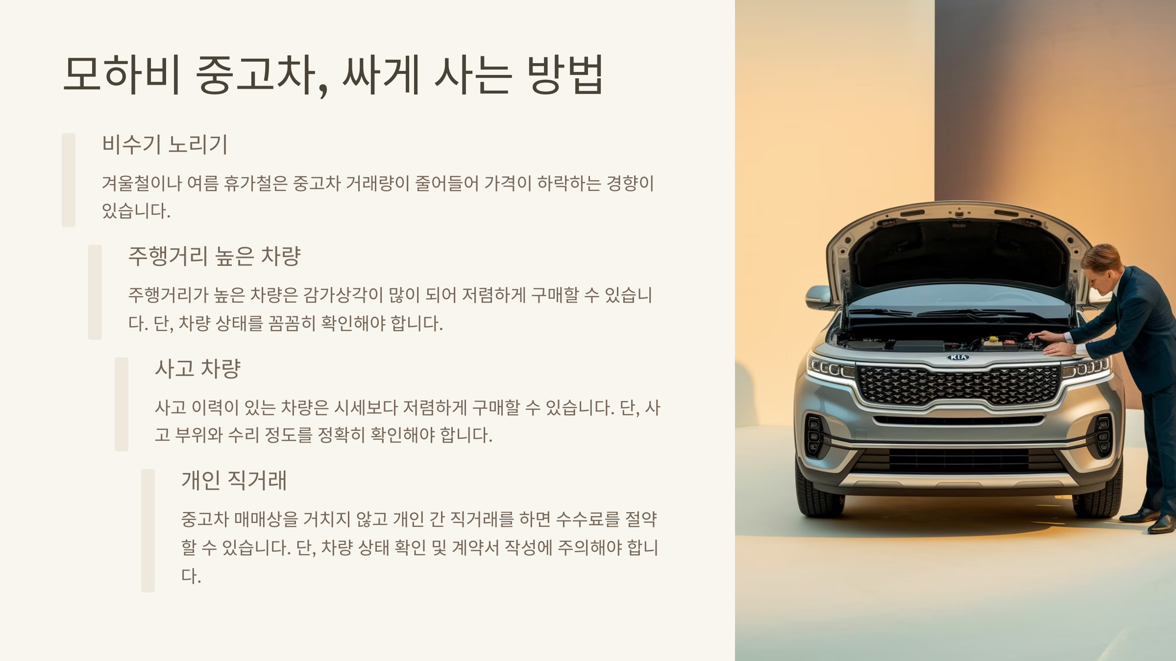 - 비수기 노리기: 일반적으로 겨울철이나 여름 휴가철은 중고차 거래량이 줄어들어 가격이 하락하는 경향이 있습니다.