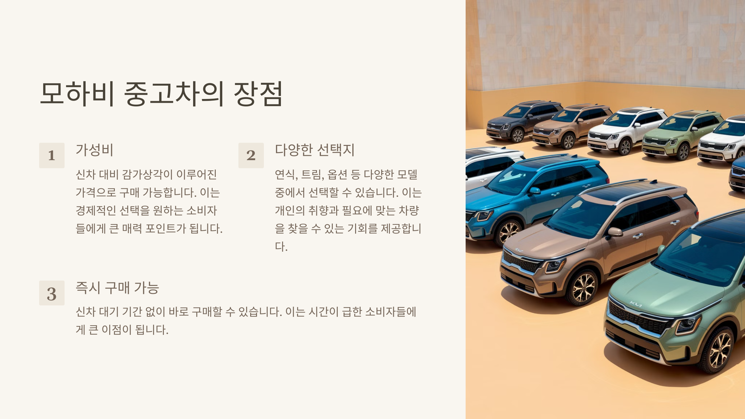 대한민국 대표 SUV, 모하비! 묵직한 존재감과 뛰어난 성능으로 꾸준한 사랑을 받고 있습니다. 신차 가격이 부담스러웠다면, 합리적인 가격의 모하비 중고차에 눈을 돌려보는 건 어떨까요? 이 글에서는 모하비 중고차 가격 정보를 꼼꼼하게 분석하고, 모하비 중고 시세 변동 추이부터 구매 팁까지 모든 것을 알려드립니다. 연식별, 모델별 상세 시세표는 물론, 놓치면 후회할 구매 가이드까지, 모하비 중고차 구매를 위한 완벽한 정보를 지금 바로 확인하세요!
