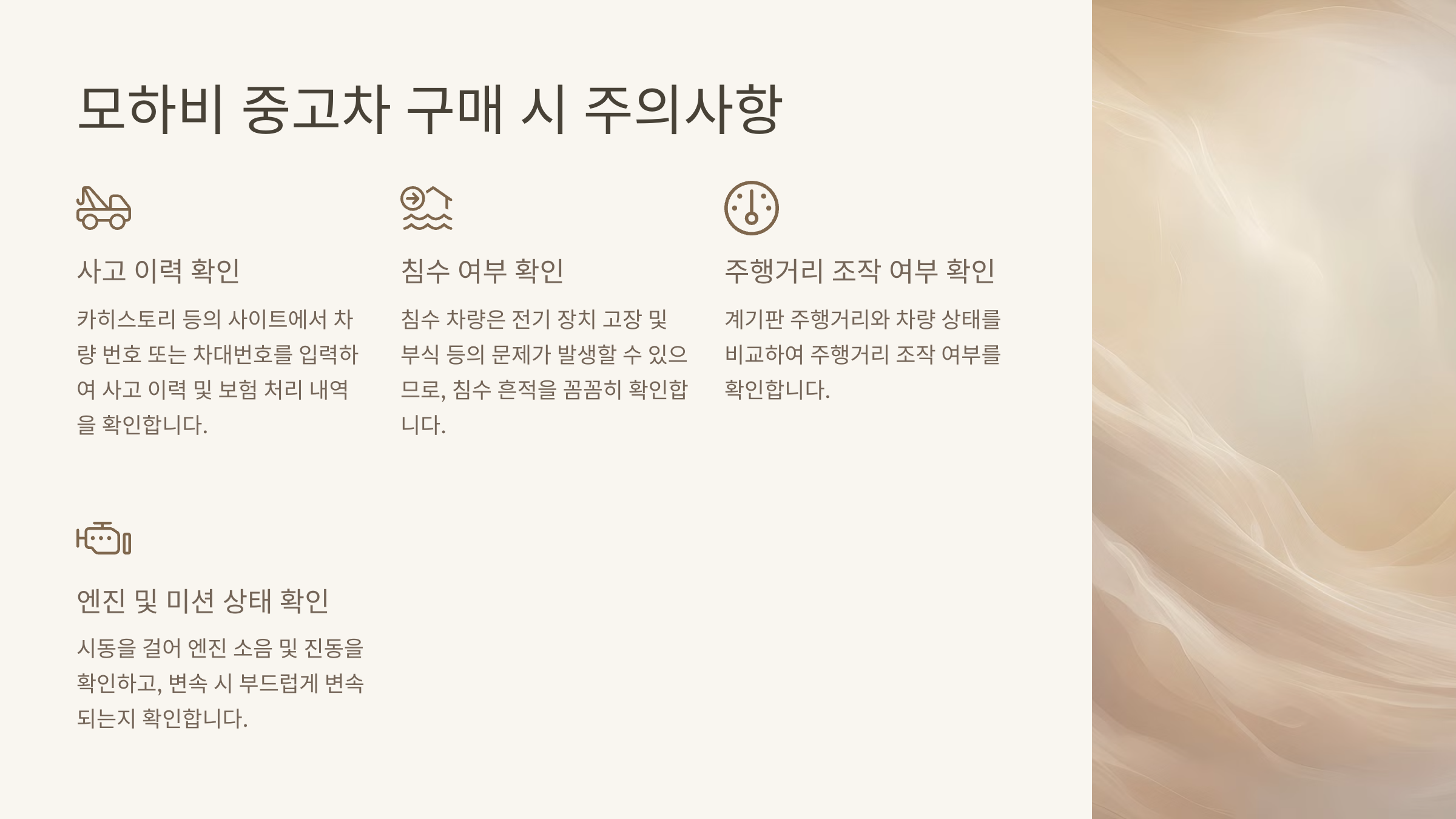 - 침수 여부 확인: 침수 차량은 전기 장치 고장 및 부식 등의 문제가 발생할 수 있으므로, 침수 흔적을 꼼꼼히 확인합니다.