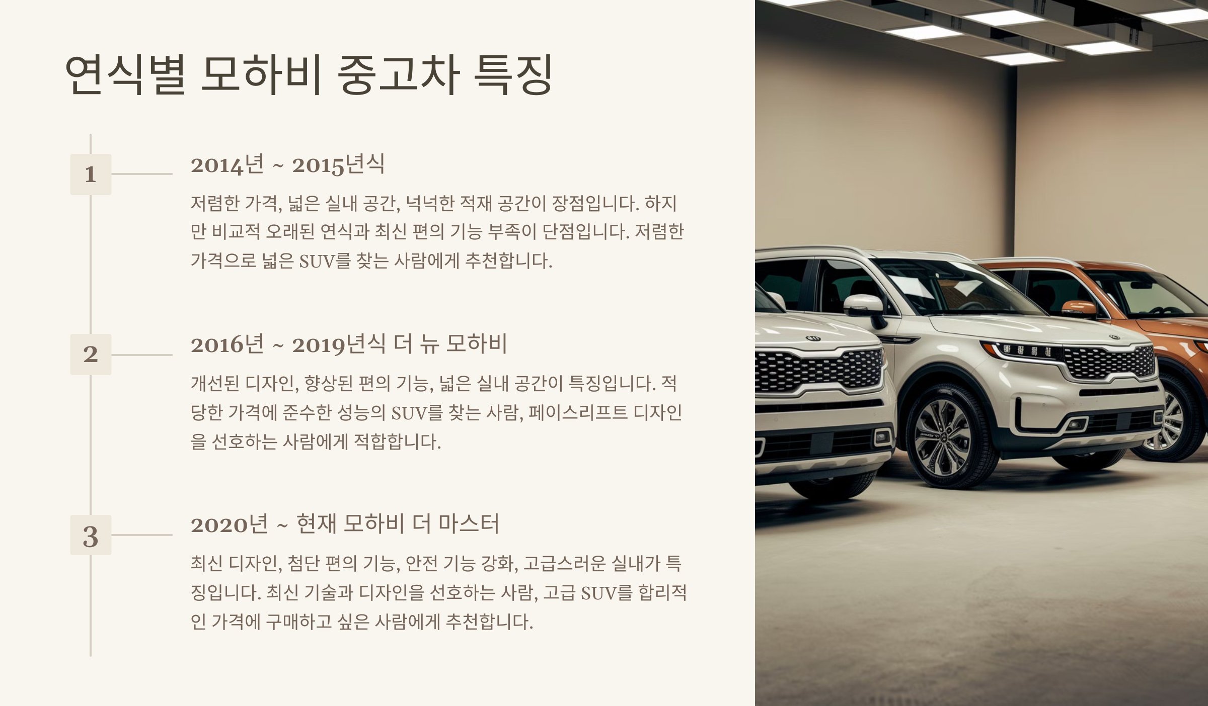 연식별로 모하비 중고차 가격과 특징을 좀 더 자세히 살펴보겠습니다.