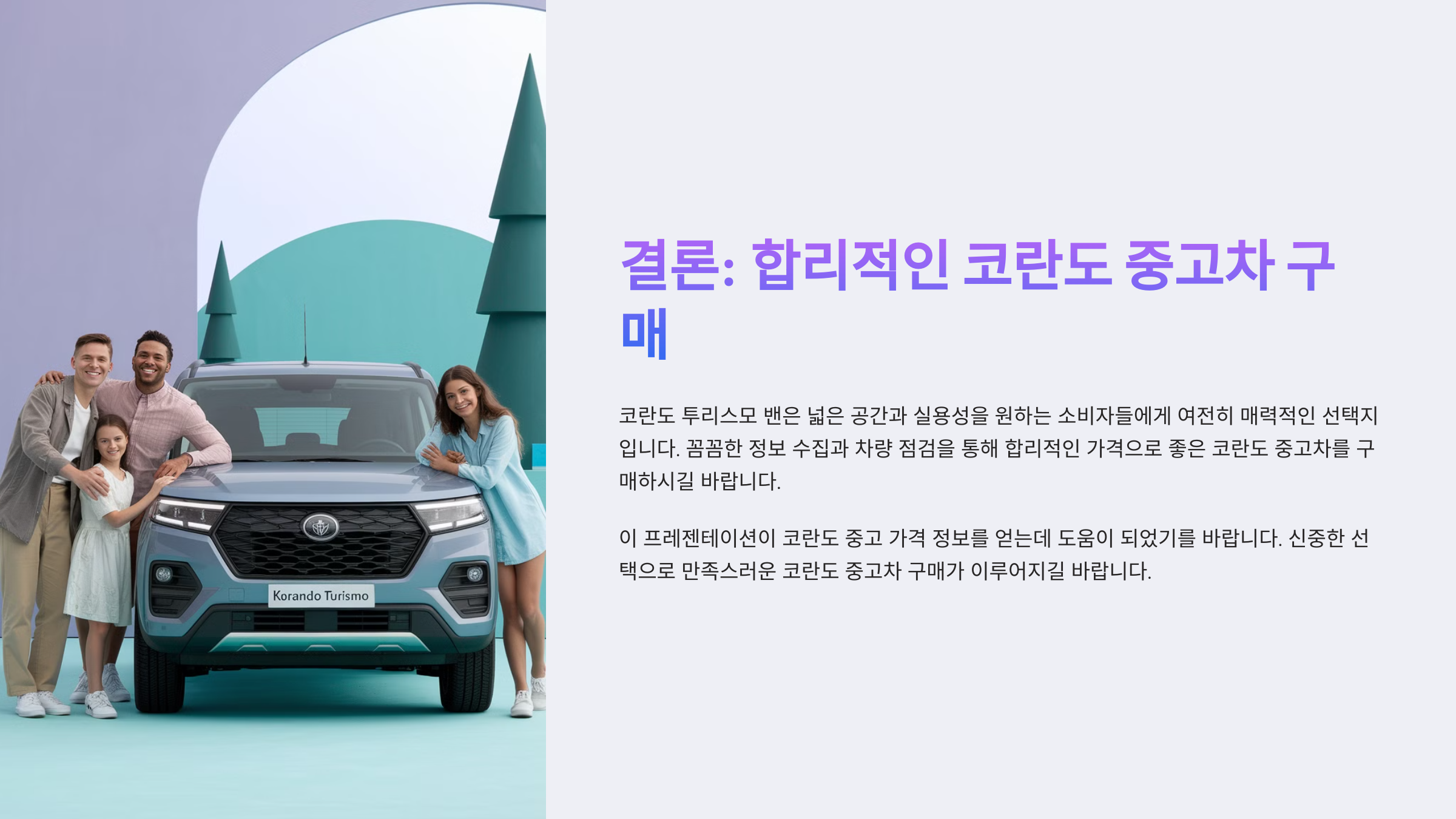 코란도 투리스모 밴은 넓은 공간과 실용성을 원하는 소비자들에게 여전히 매력적인 선택지입니다. 꼼꼼한 정보 수집과 차량 점검을 통해 합리적인 가격으로 좋은 코란도 중고차를 구매하시길 바랍니다. 이 글이 코란도 중고 가격 정보를 얻는데 도움이 되었기를 바랍니다.