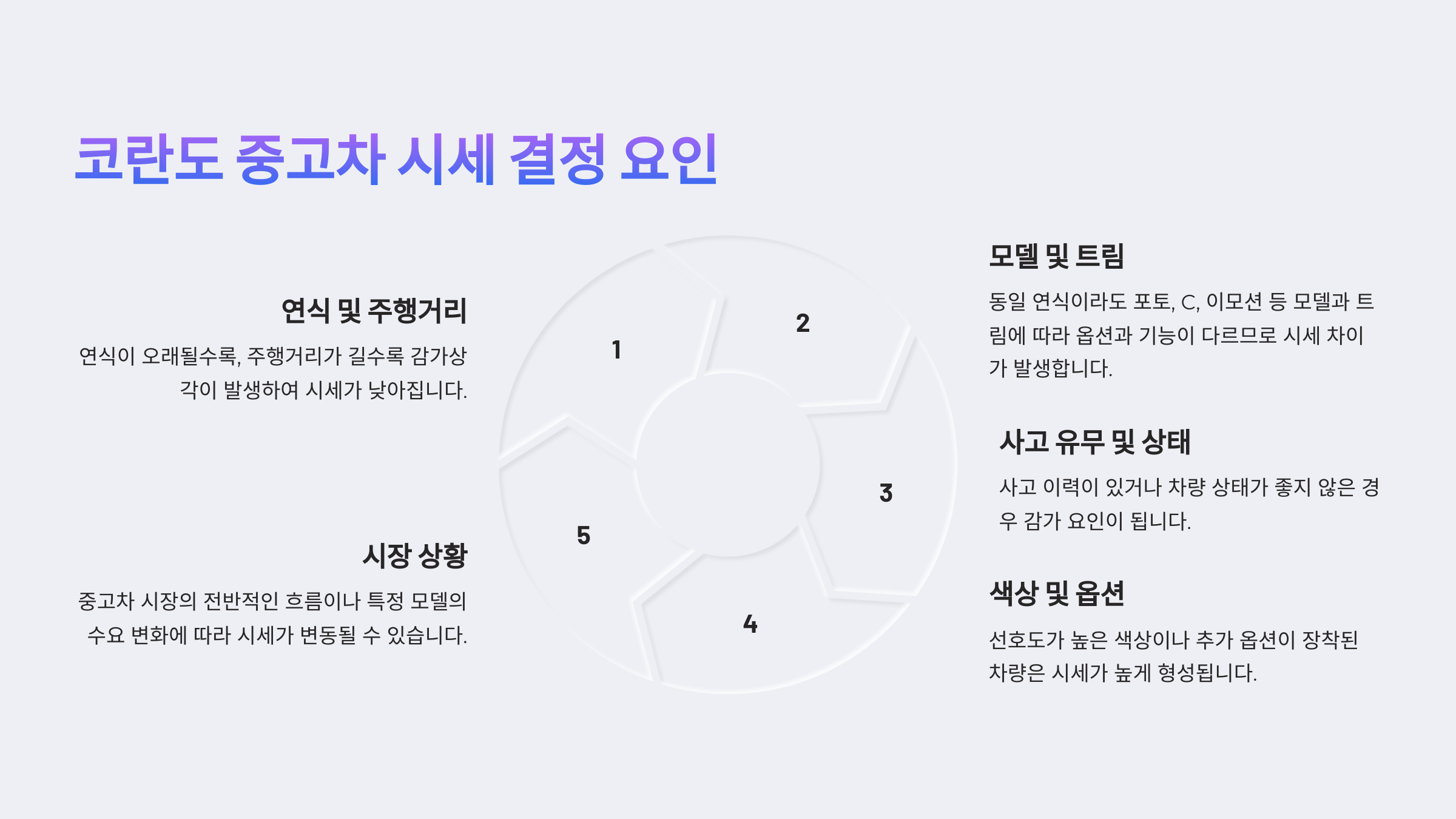 코란도 중고차 시세는 여러 요인에 의해 결정됩니다. 주요 요인들을 살펴보겠습니다.