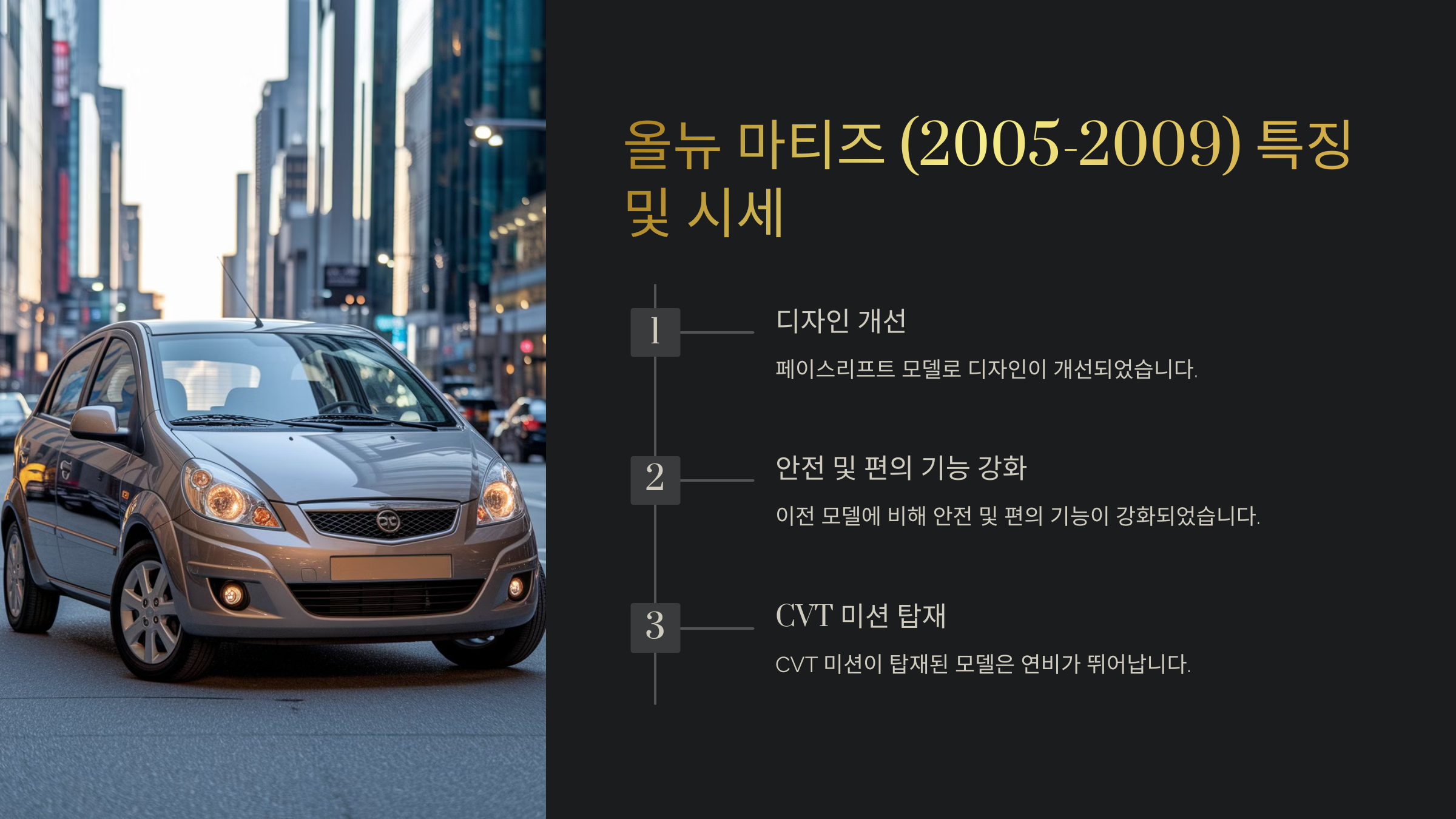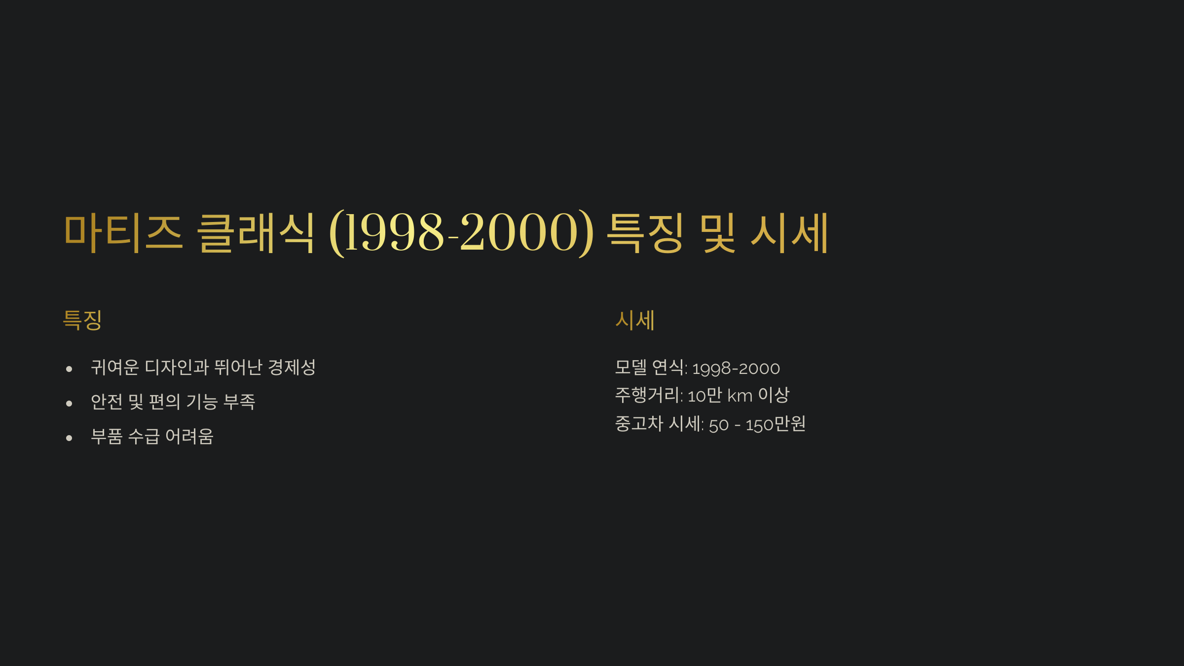 마티즈는 1998년부터 2015년까지 다양한 모델로 출시되었습니다. 각 연식별 특징을 파악하고, 중고차 시세를 비교 분석하여 자신에게 맞는 마티즈를 선택하는 것이 중요합니다.
