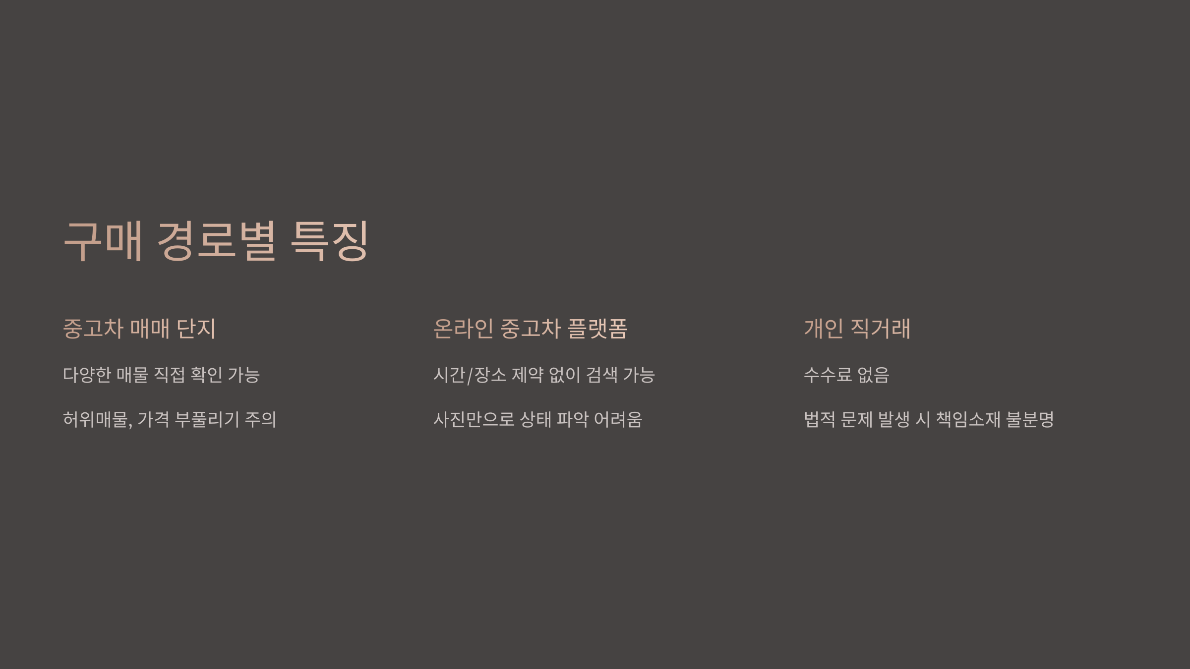 - 온라인 중고차 플랫폼: 시간과 장소에 구애받지 않고 매물을 검색할 수 있다는 장점이 있지만, 사진만으로는 차량 상태를 정확히 파악하기 어렵다는 단점이 있습니다.