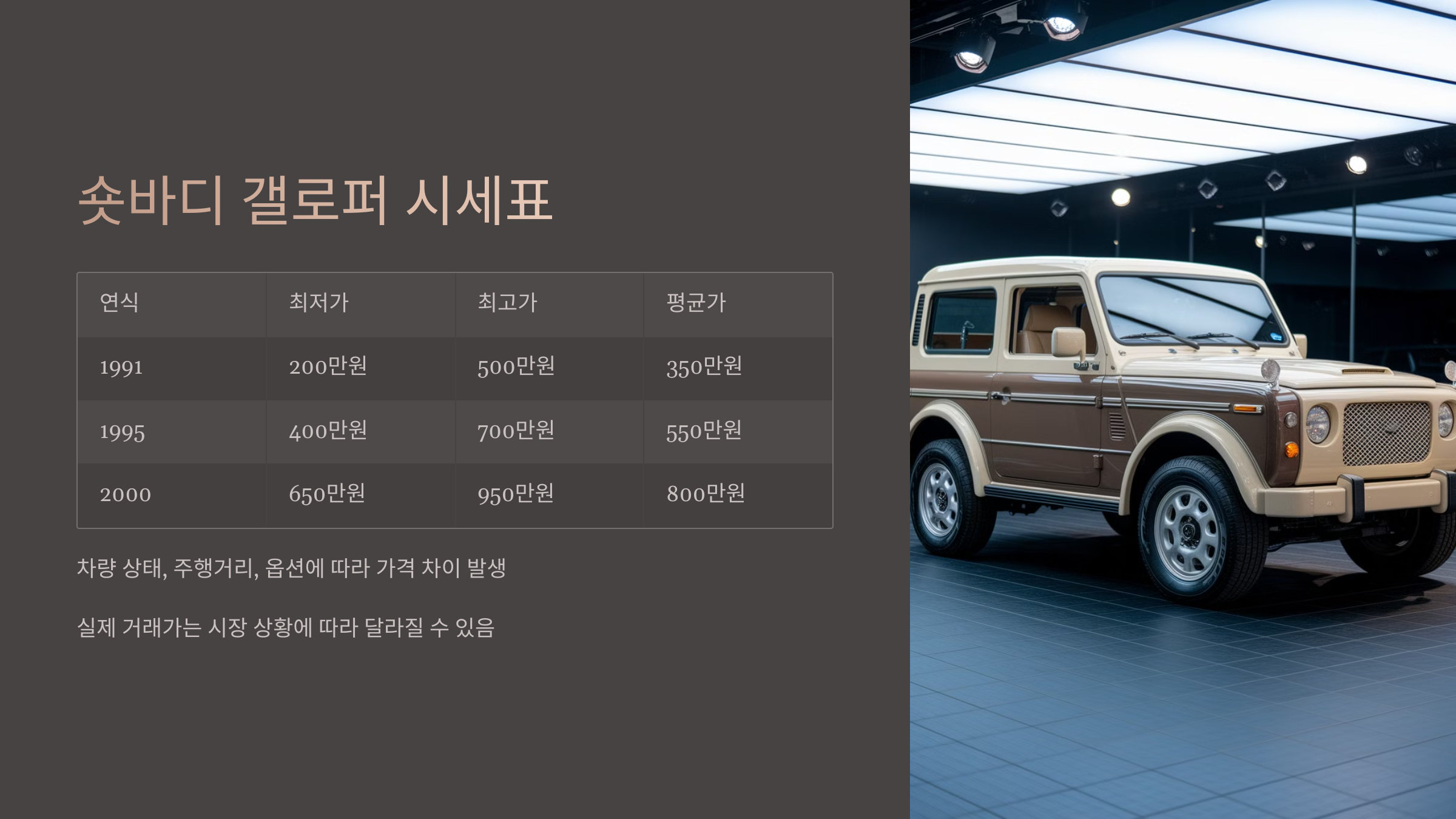 다음은 최근 10년간 갤로퍼 중고차 시세를 연식별, 모델별로 정리한 표입니다. 실제 중고차 거래 데이터를 기반으로 작성되었으며, 시장 상황에 따라 변동될 수 있습니다. 갤로퍼 중고차 가격은 차량 상태, 주행 거리, 옵션 등에 따라 차이가 있을 수 있으므로 참고용으로 활용하시기 바랍니다.