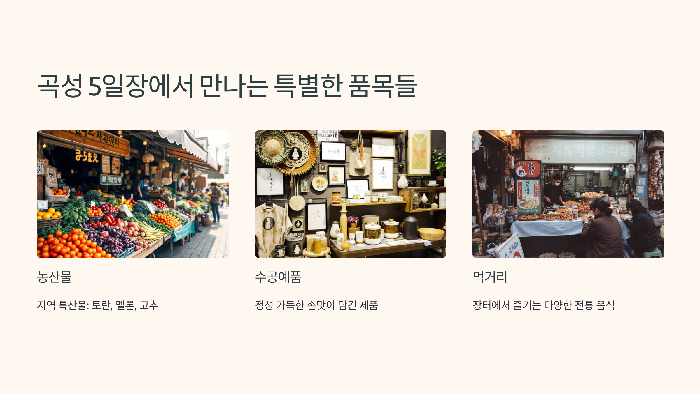 곡성 오일장은 매월 3, 8, 13, 18, 23, 28일마다 열려요. 이제 어떤 상품을 만날 수 있는지 알아볼까요? 🛍️