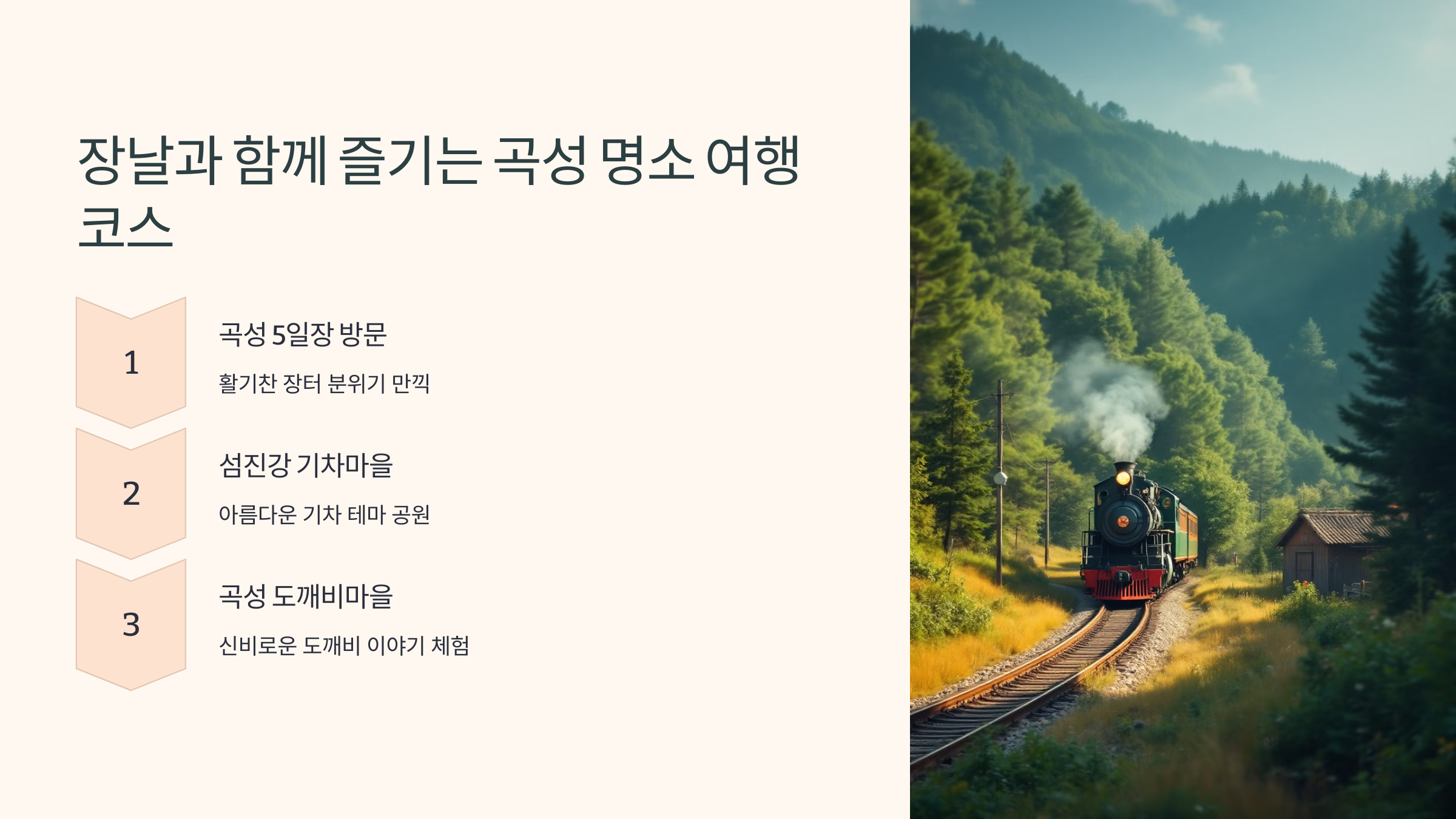 이제 장날에 함께 즐길 수 있는 곡성의 명소들도 알아볼까요? 🚂