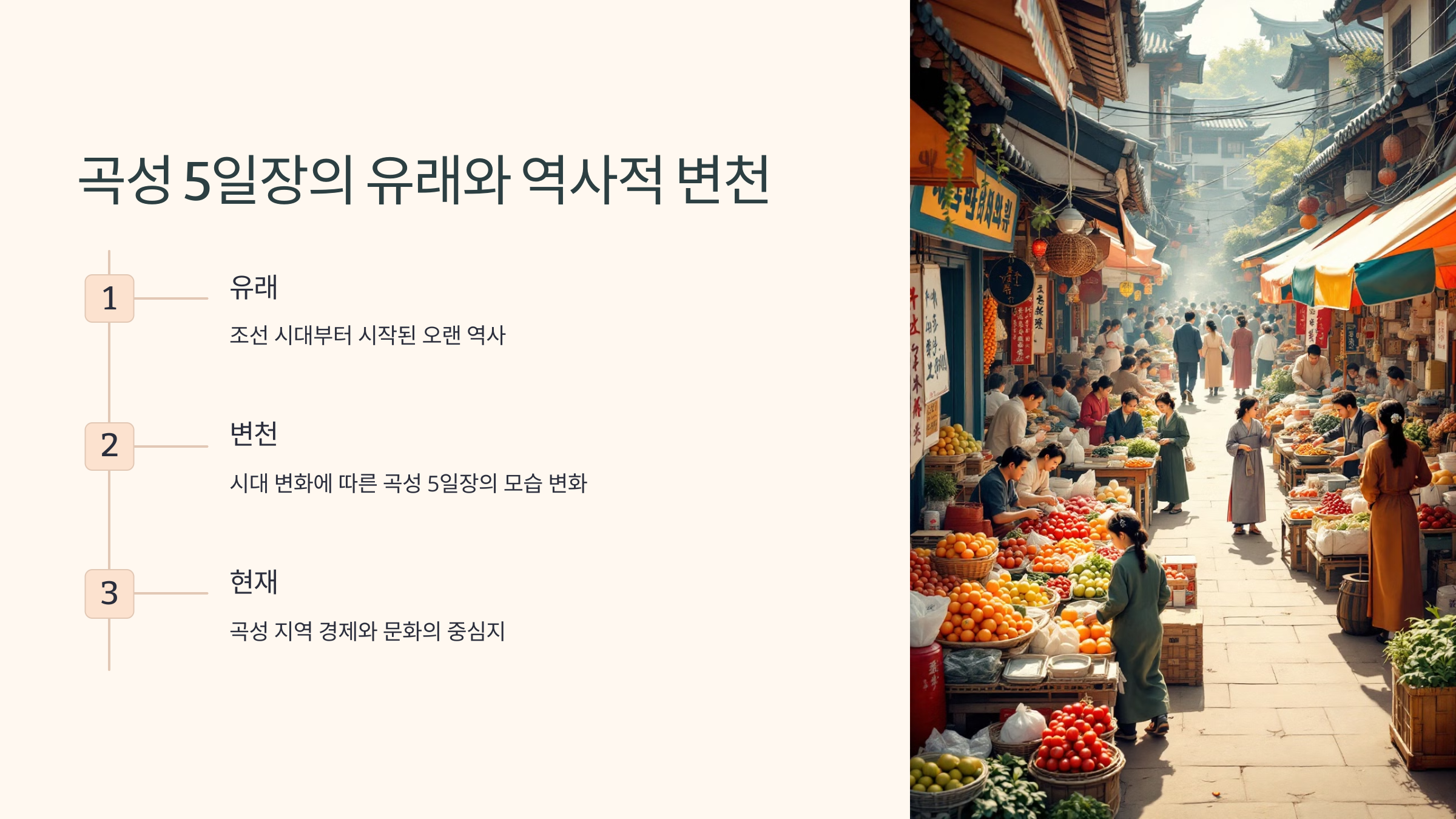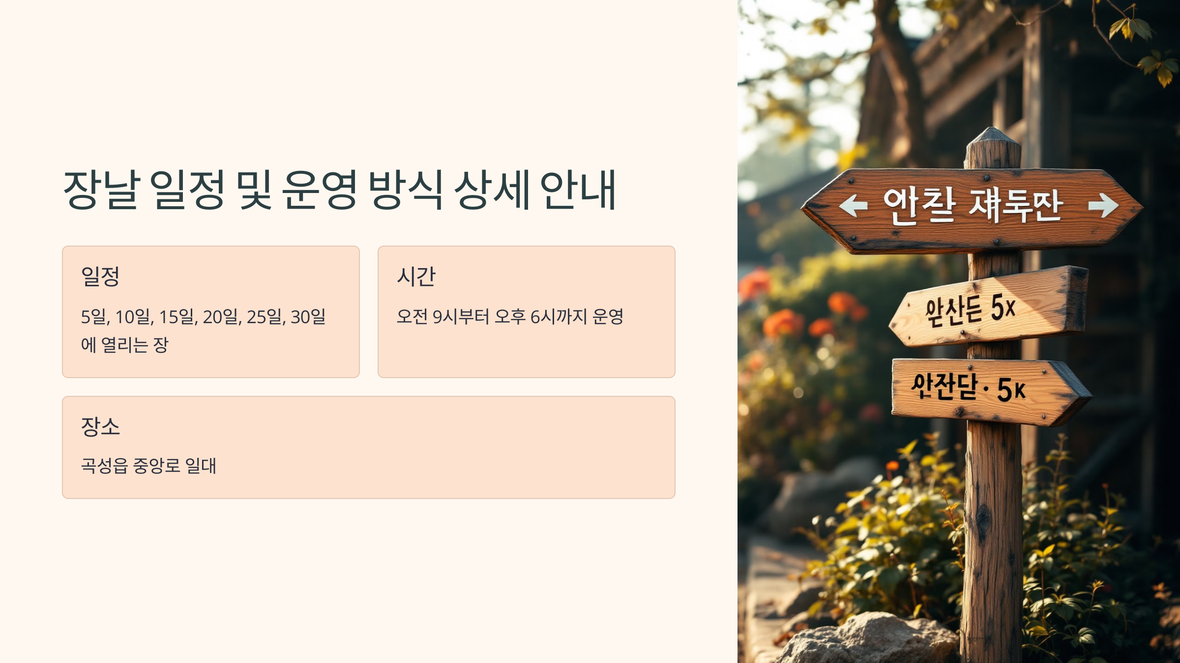 이제 곡성 오일장의 역사와 일정, 즐길 거리 등을 자세히 알아볼까요? 📅