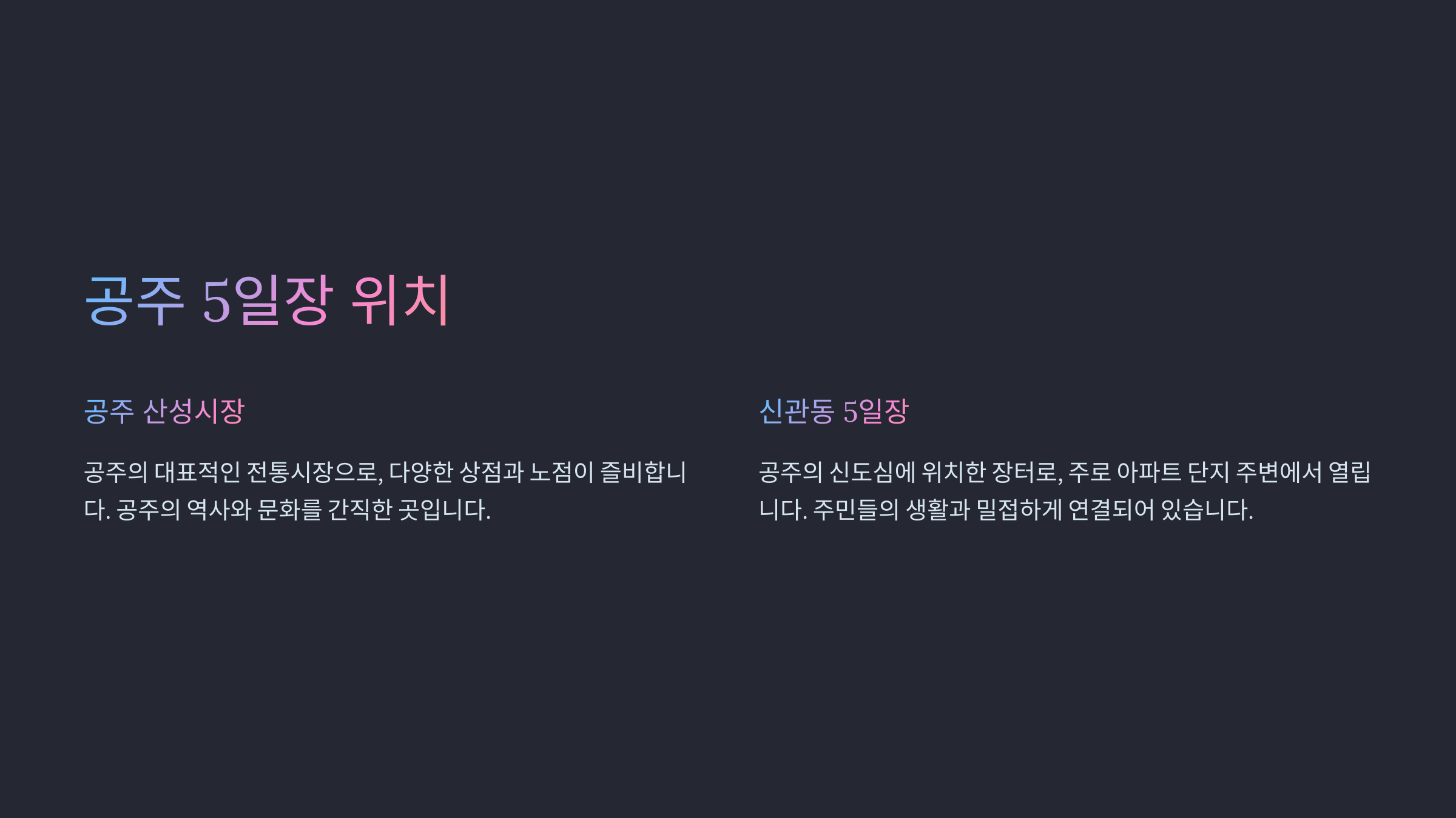 공주에는 크게 두 곳에서 5일장이 열립니다. 바로 공주 산성시장과 신관동입니다. 각각의 위치와 특징을 자세히 알아보겠습니다.