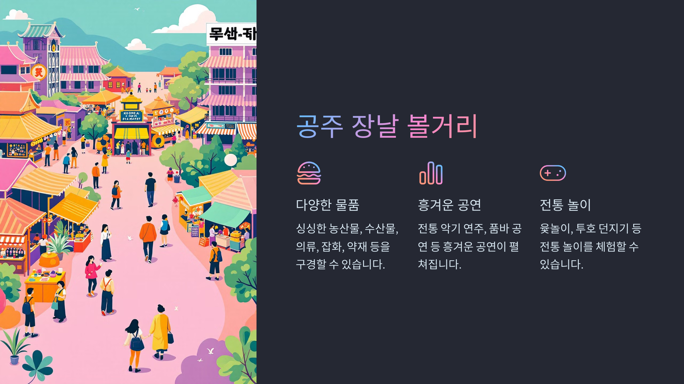 공주 장날은 단순히 물건을 사는 곳이 아닌, 다양한 볼거리가 가득한 문화 공간입니다.