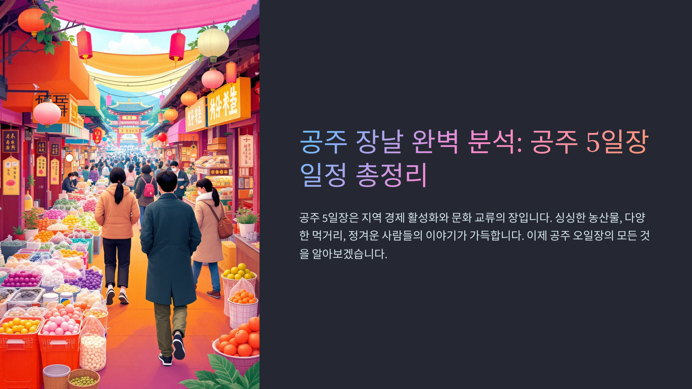 공주 시민들의 삶과 함께 해 온 전통적인 공주 장날! 싱싱한 농산물부터 다양한 먹거리, 그리고 정겨운 사람들의 이야기가 가득한 공주 5일장은 단순한 장터를 넘어 지역 경제 활성화와 문화 교류의 장 역할을 톡톡히 해내고 있습니다. 하지만 언제 열리는지, 어디로 가야 하는지 헷갈리셨던 분들을 위해 공주 장날, 공주 5일장 정보를 속 시원하게 정리했습니다. 지금부터 공주 오일장에 대한 모든 것을 파헤쳐 보겠습니다.