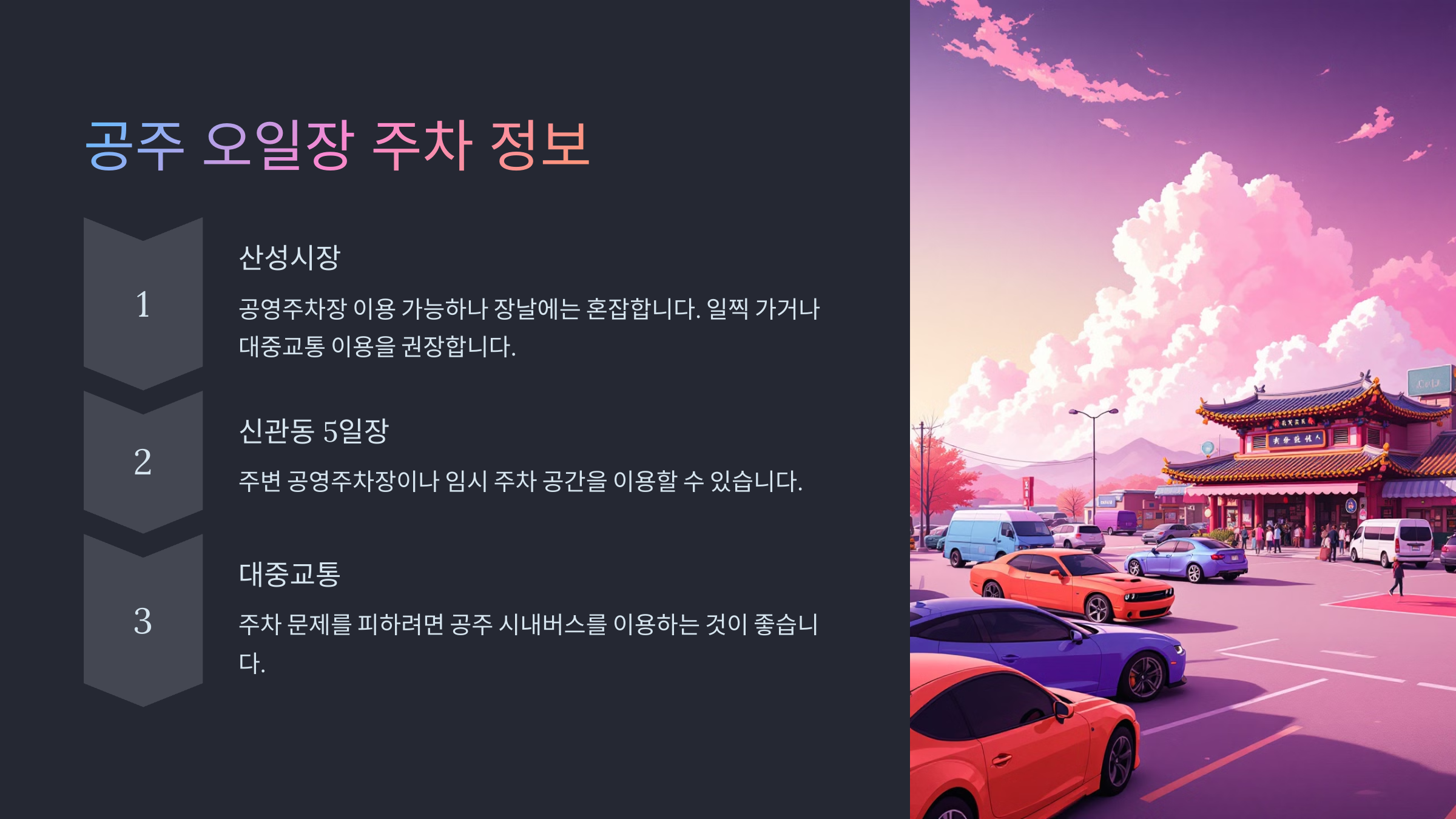 공주 장날을 방문할 때 가장 큰 고민 중 하나가 바로 주차 문제입니다. 특히 산성시장은 주차 공간이 협소하여 혼잡할 수 있습니다. 따라서 미리 주차 정보를 확인하고 가는 것이 좋습니다.