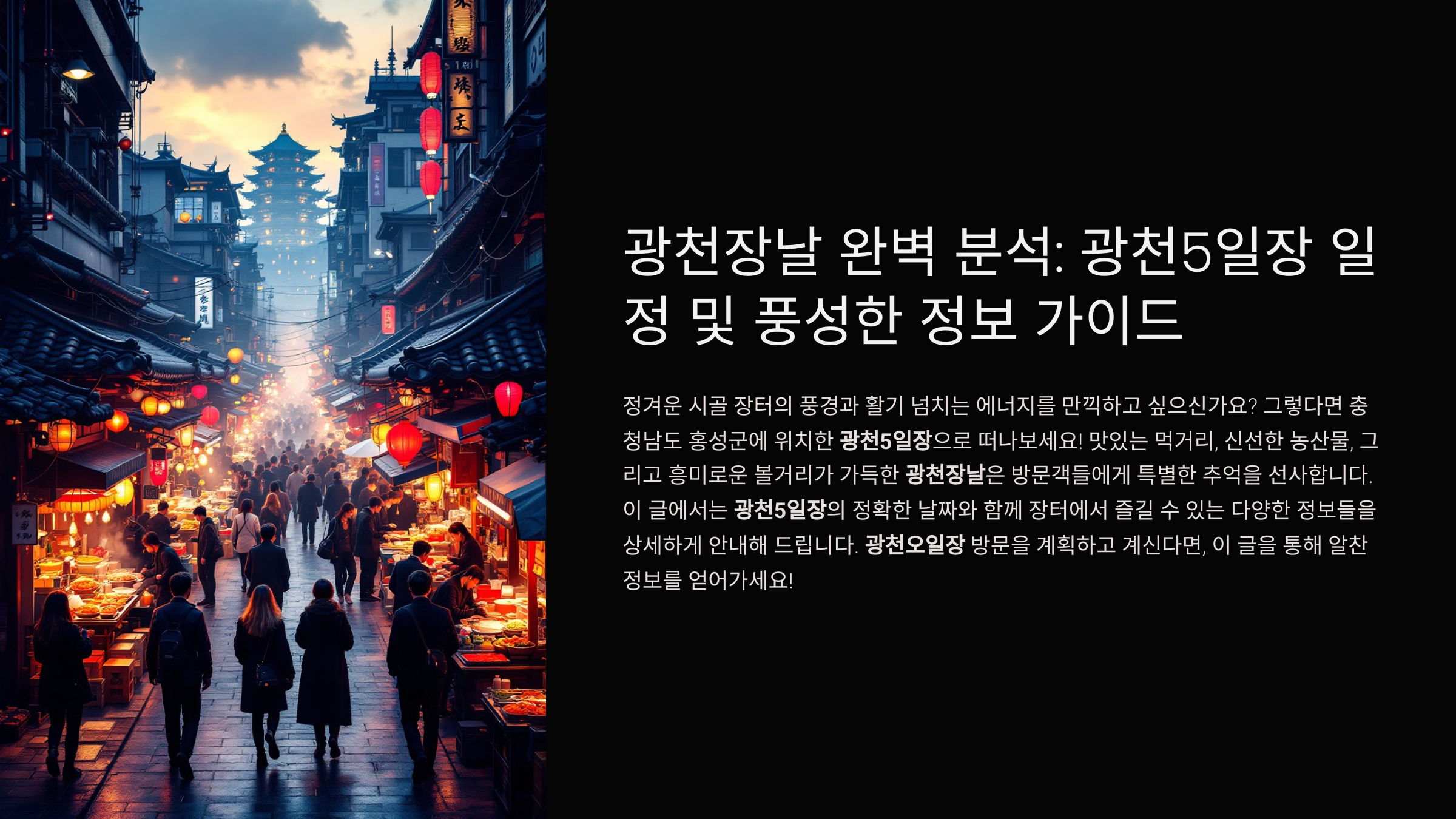 정겨운 시골 장터의 풍경과 활기 넘치는 에너지를 만끽하고 싶으신가요? 그렇다면 충청남도 홍성군에 위치한 광천5일장으로 떠나보세요! 맛있는 먹거리, 신선한 농산물, 그리고 흥미로운 볼거리가 가득한 광천장날은 방문객들에게 특별한 추억을 선사합니다. 이 글에서는 광천5일장의 정확한 날짜와 함께 장터에서 즐길 수 있는 다양한 정보들을 상세하게 안내해 드립니다. 광천오일장 방문을 계획하고 계신다면, 이 글을 통해 알찬 정보를 얻어가세요!