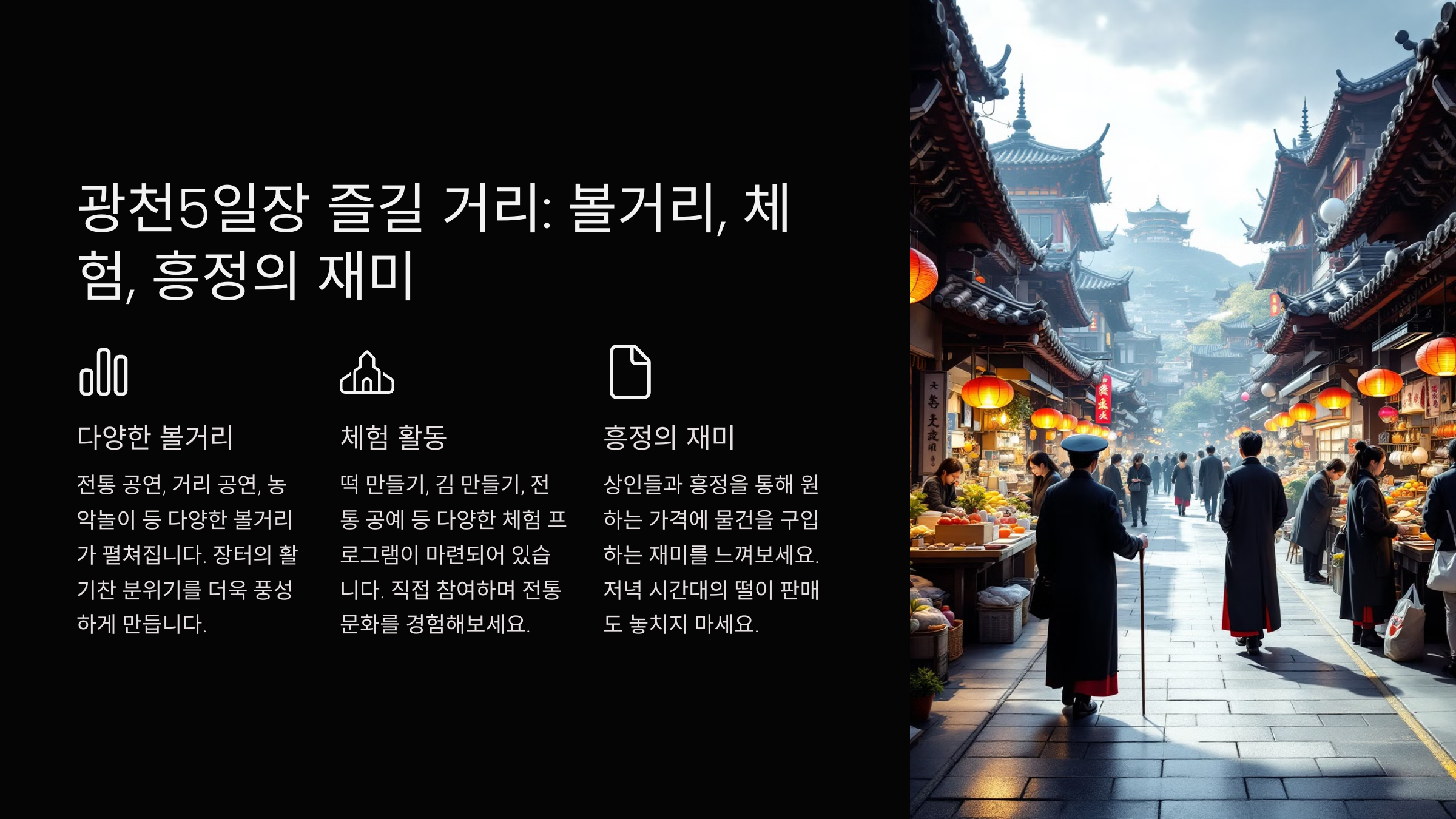 광천5일장은 단순히 물건을 사고파는 장소가 아니라, 다양한 즐길 거리가 있는 곳입니다. 장터에는 다양한 볼거리가 있으며, 전통 공연, 거리 공연, 농악놀이 등이 펼쳐지기도 합니다. 또한, 장터에서 물건을 사는 것 외에도 다양한 체험 활동을 할 수 있습니다. 떡 만들기 체험, 김 만들기 체험, 전통 공예 체험 등 다양한 프로그램이 마련되어 있습니다.
