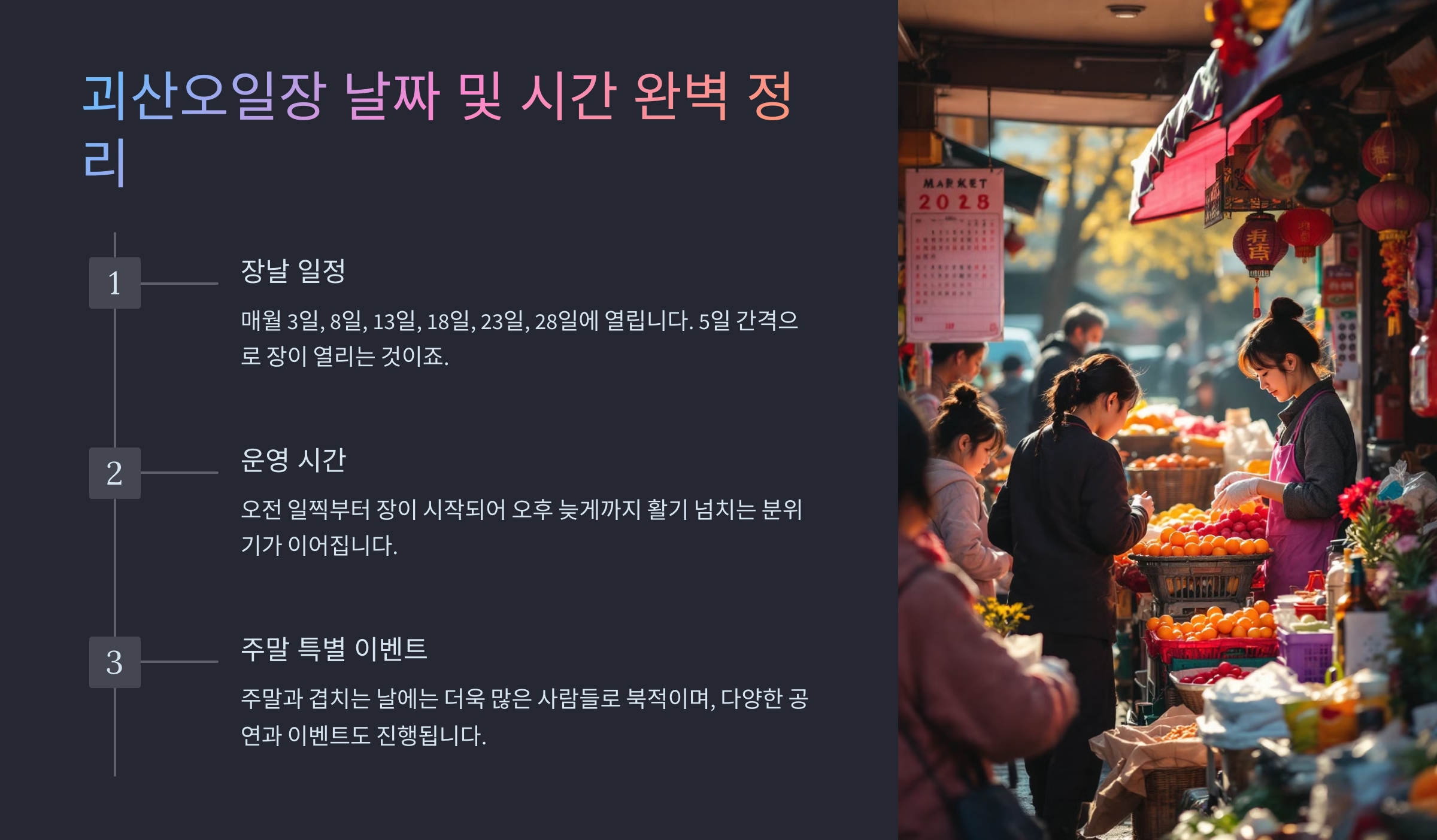 괴산장날은 매월 3일과 8일, 13일과 18일, 23일과 28일에 열립니다. 즉, 5일 간격으로 장이 열리는 것이죠. 오전 일찍부터 장이 시작되어 오후 늦게까지 활기 넘치는 분위기가 이어집니다. 특히 주말과 겹치는 날에는 더욱 많은 사람들로 북적이며, 다양한 공연과 이벤트도 진행되어 더욱 풍성한 볼거리를 제공합니다. 장날을 놓치지 않도록 미리 달력에 표시해두고 방문 계획을 세워보세요.