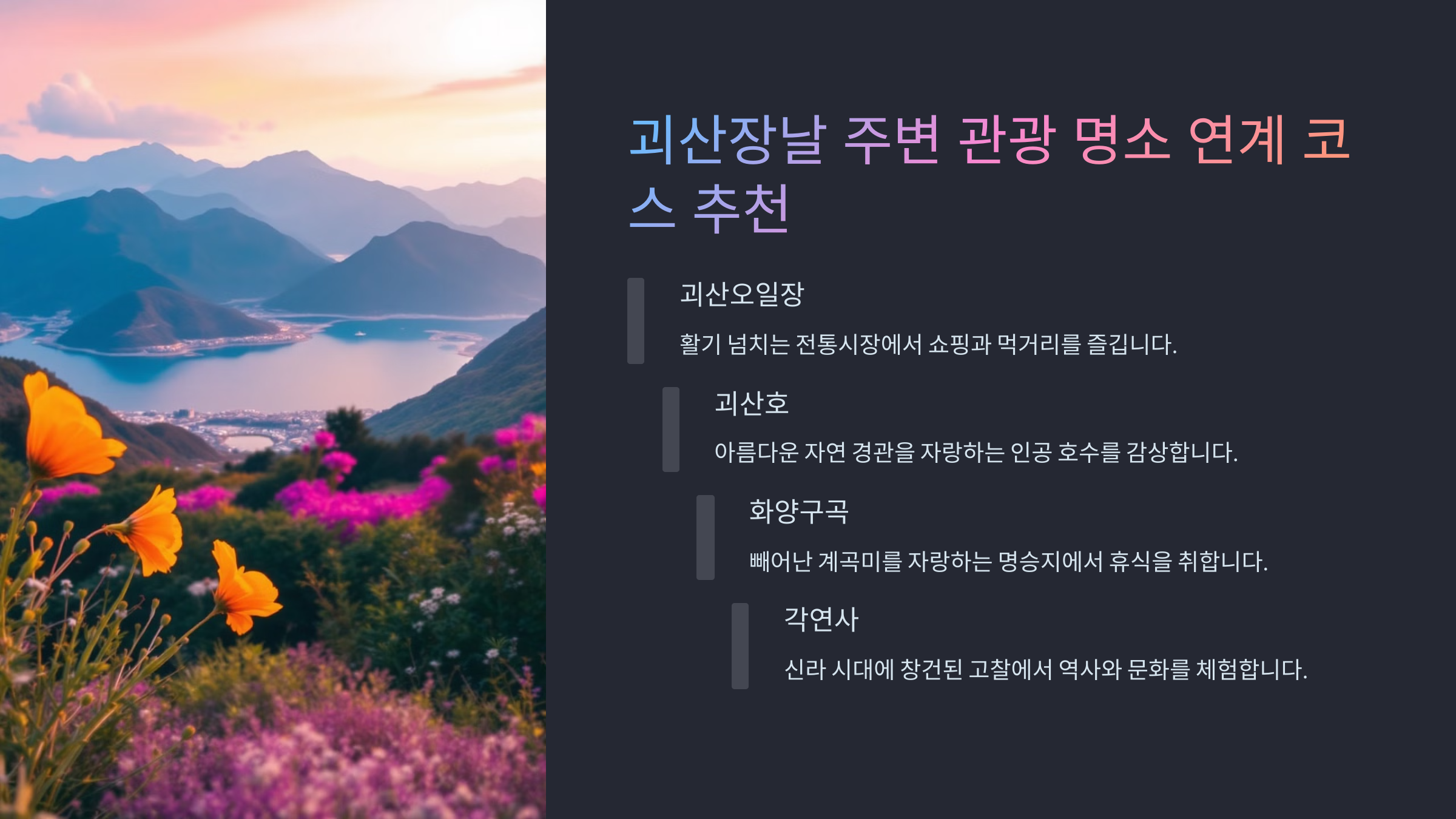 괴산오일장 방문과 함께 주변 관광 명소를 함께 둘러보는 것을 추천합니다. 아름다운 자연을 만끽할 수 있는 괴산호, 시원한 계곡물이 흐르는 화양구곡, 역사와 문화를 체험할 수 있는 각연사 등, 괴산에는 다양한 볼거리가 있습니다. 괴산5일장에서 즐거운 시간을 보낸 후, 주변 관광 명소를 방문하여 더욱 풍성한 여행을 만들어보세요.