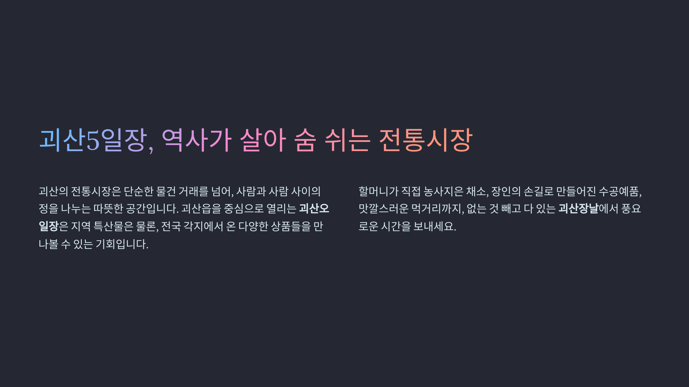 괴산에는 오랜 역사를 자랑하는 전통시장이 있습니다. 단순한 물건 거래를 넘어, 사람과 사람 사이의 정을 나누는 따뜻한 공간입니다. 괴산읍을 중심으로 열리는 괴산오일장은 지역 특산물은 물론, 전국 각지에서 온 다양한 상품들을 만나볼 수 있는 기회입니다. 할머니가 직접 농사지은 채소, 장인의 손길로 만들어진 수공예품, 맛깔스러운 먹거리까지, 없는 것 빼고 다 있는 괴산장날에서 풍요로운 시간을 보내세요.