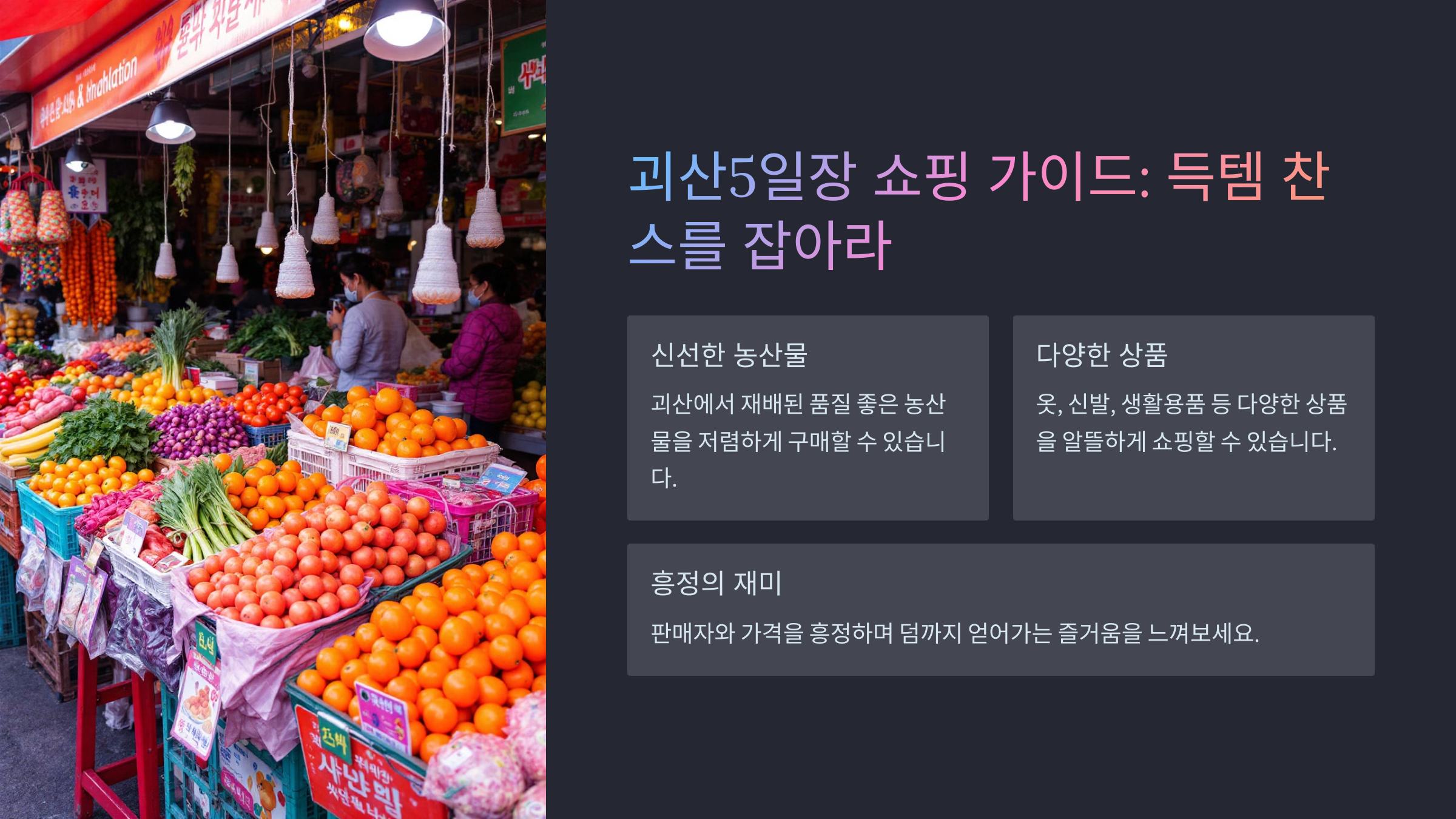 충청북도 괴산은 아름다운 자연과 더불어 따뜻한 인심이 살아 숨 쉬는 곳입니다. 특히 괴산5일장은 지역 주민들의 삶의 터전이자, 도시민들에게는 잊혀져가는 전통시장의 정취를 느낄 수 있는 특별한 공간입니다. 활기 넘치는 괴산오일장에서 신선한 농산물과 다양한 먹거리를 즐기며, 덤까지 얹어주는 푸근한 인심을 느껴보세요. 지금부터 괴산장날 5일장 일정과 풍성한 볼거리를 자세히 안내해 드리겠습니다.