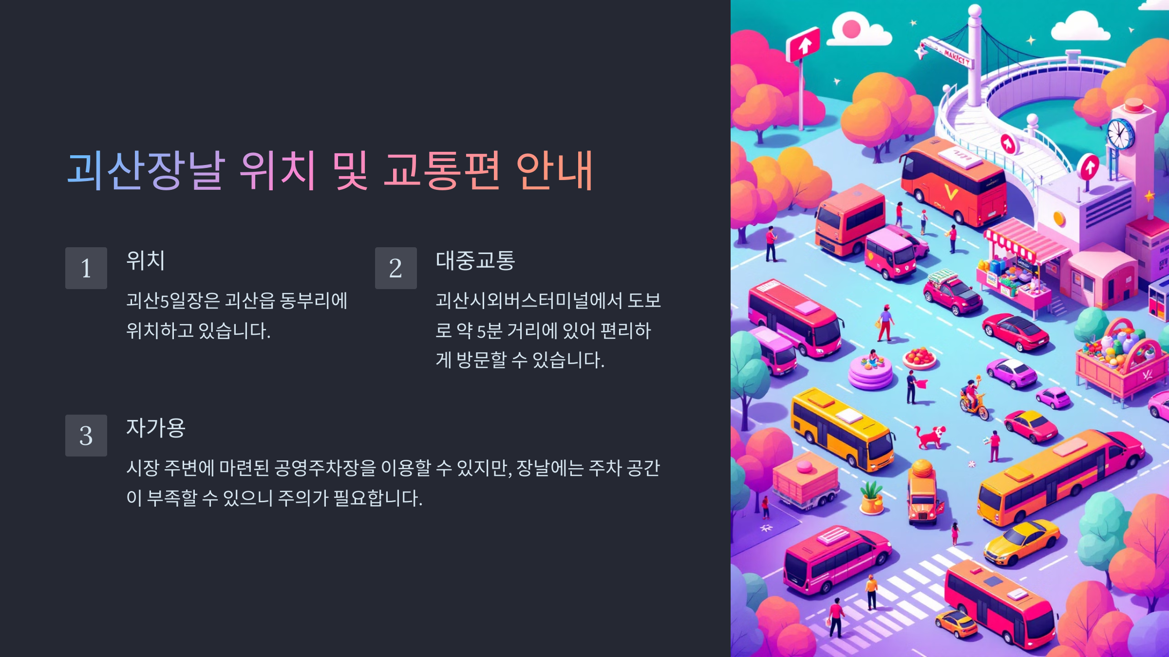 | 자가용 | 시장 주변 공영주차장 이용 (혼잡 예상) |