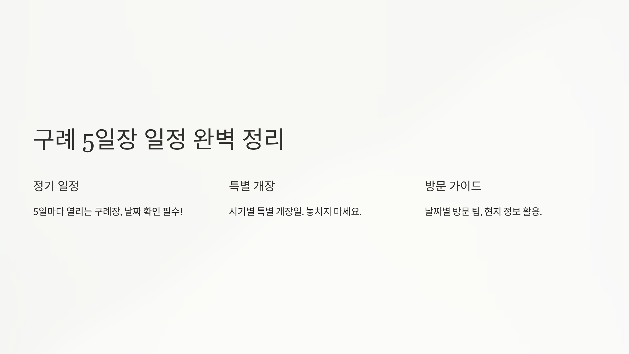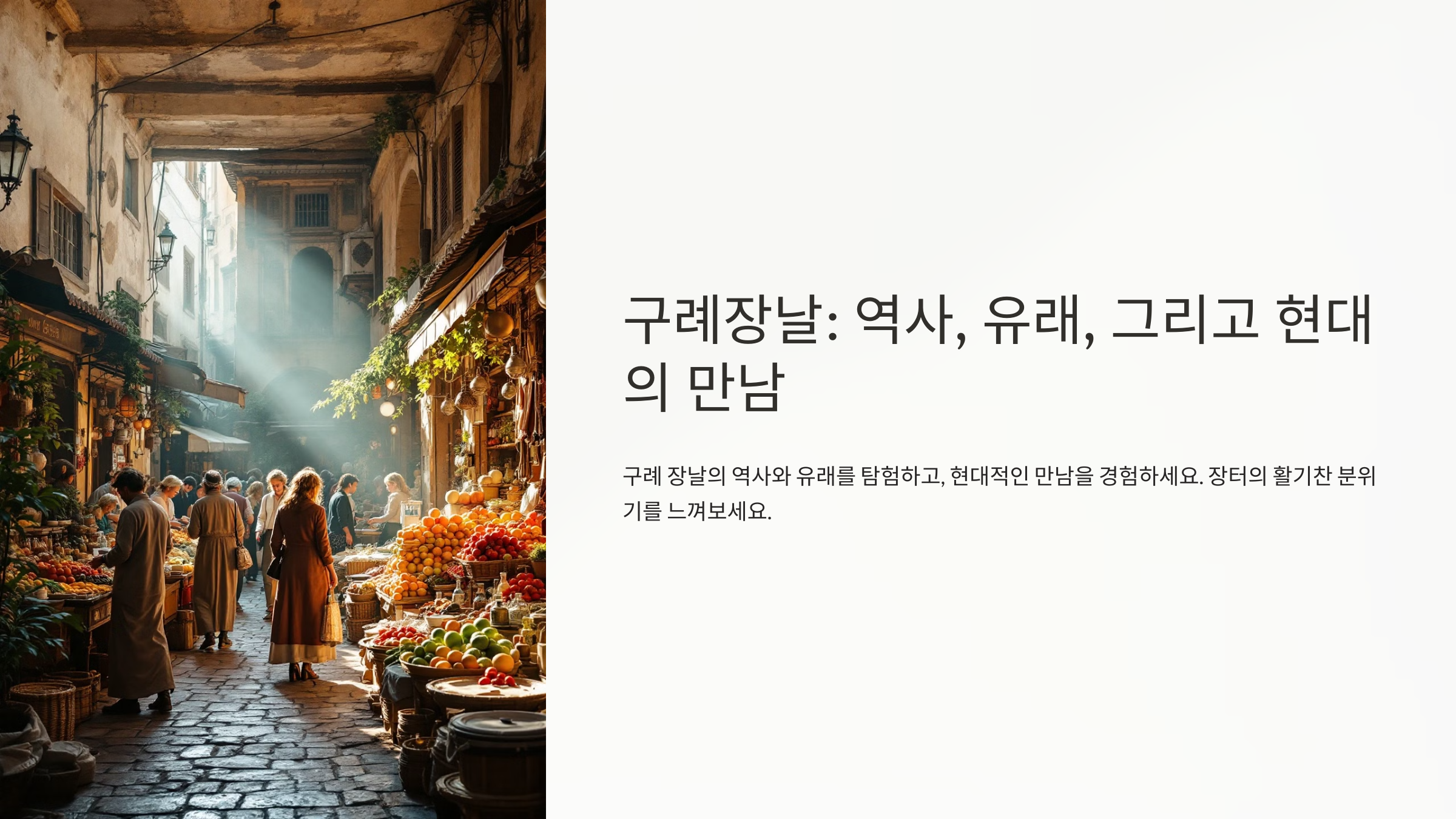 이제 구례 5일장의 역사, 일정, 특산물, 위치, 즐길거리 등을 하나씩 살펴볼게요! 📢