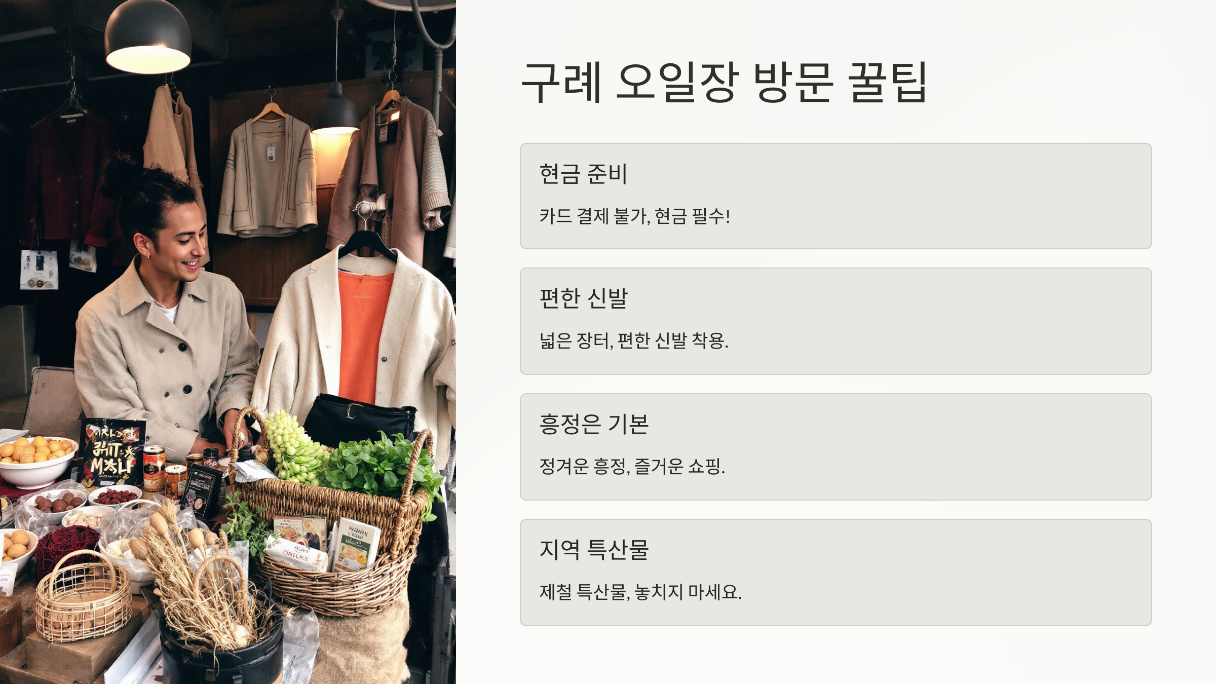 구례 오일장은 단순한 시장이 아니라, 전통과 현대가 공존하는 살아 있는 문화 공간이에요. 신선한 농산물부터 맛있는 먹거리, 따뜻한 인심까지 느낄 수 있는 곳이죠. 방문할 기회가 있다면 꼭 한 번 경험해 보세요! 🛍️🚀