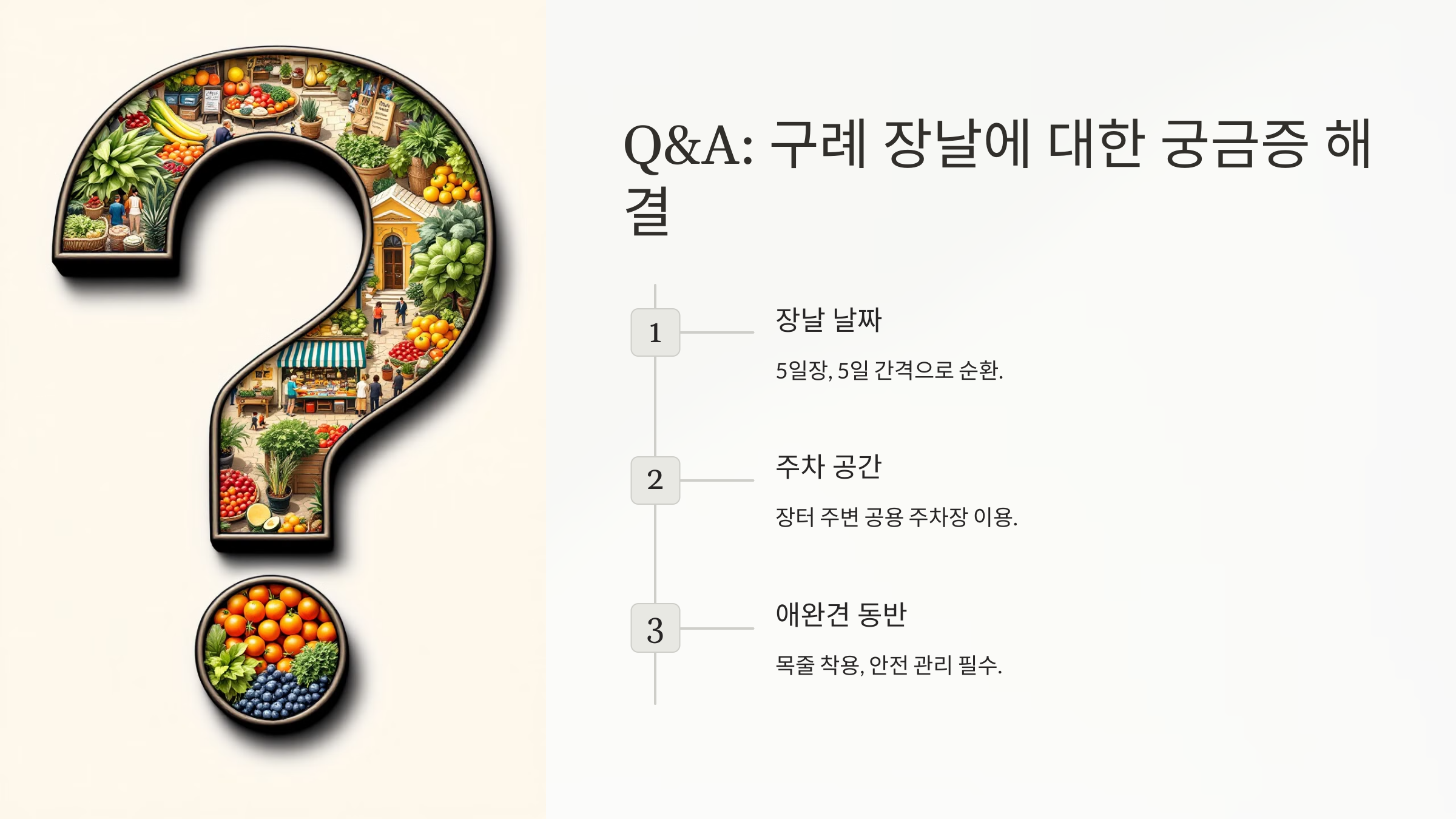 A3. 구례 5일장 근처에는 공영주차장이 마련되어 있어요. 장날에는 사람이 몰려 주차장이 혼잡할 수 있으니, 대중교통을 이용하는 것도 추천해요.