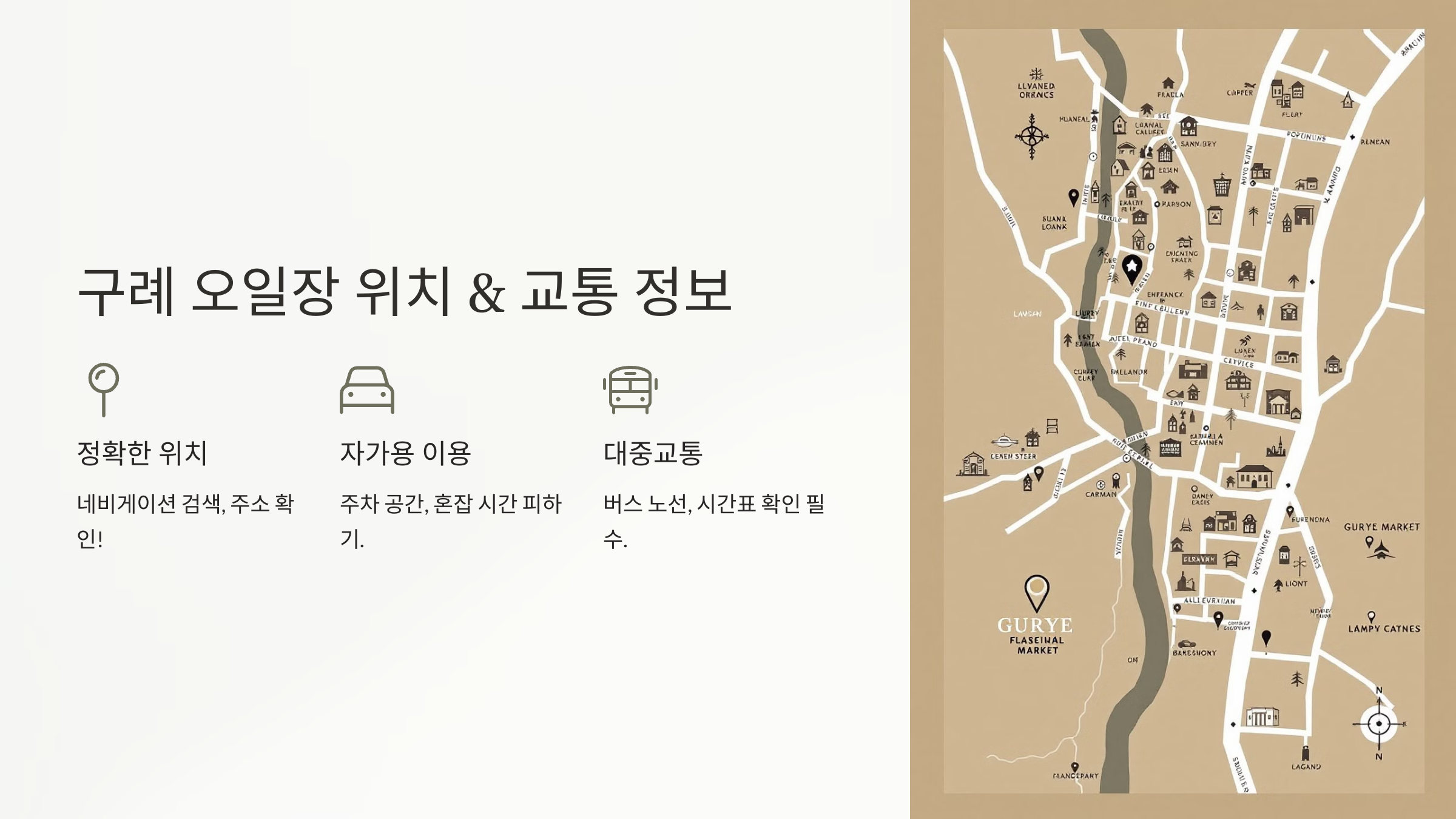 🚗 자가용 이용 시: 네비게이션에 '구례 오일장'을 검색하면 쉽게 찾을 수 있어요. 주차장은 시장 근처 공영주차장을 이용하면 돼요.