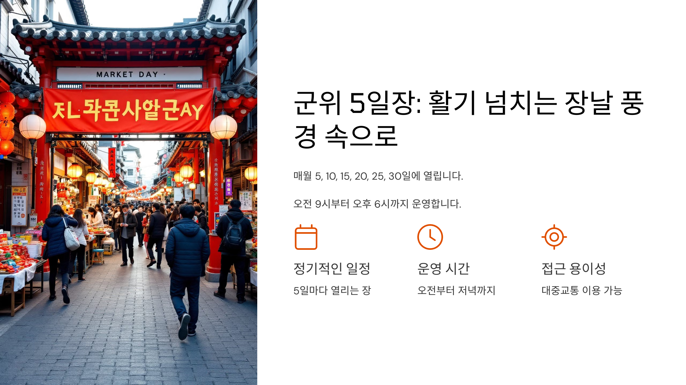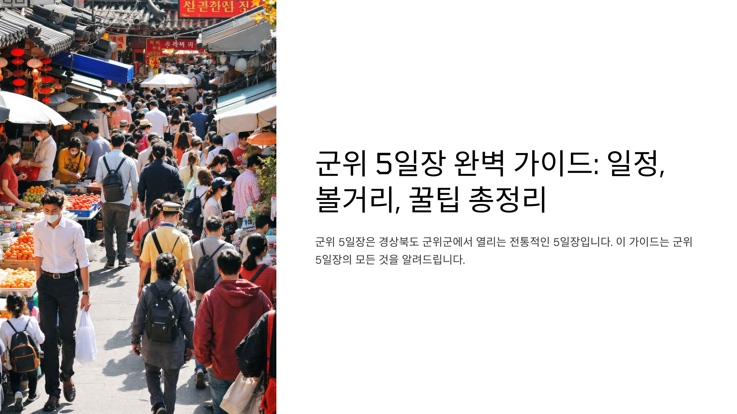 안녕하세요, 여러분! 혹시 전통시장의 정겨운 분위기를 좋아하시나요? 😊 군위군에서 열리는 군위 5일장(오일장)은 오랜 역사를 자랑하는 장터로, 지역 주민뿐만 아니라 관광객들에게도 인기가 많습니다. 장날을 잘 맞춰 가면 신선한 농산물과 다양한 먹거리를 저렴하게 구매할 수 있는데요! 오늘은 군위장날의 날짜와 5일장 일정을 정리해서 알려드리겠습니다. 장날을 놓치지 않도록 지금부터 꼼꼼히 확인해 보세요! 🏡🛍️