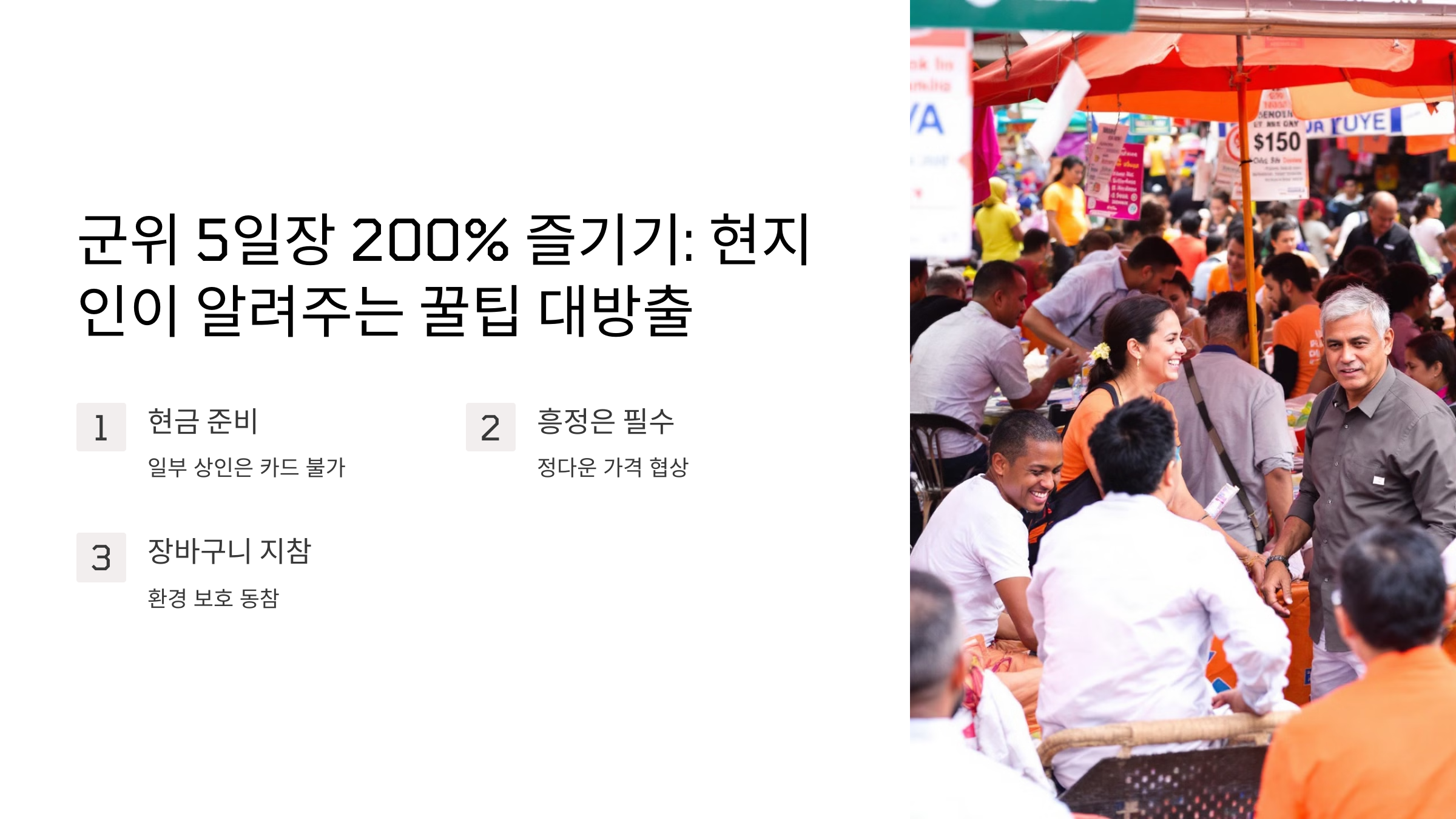 이른 시간 방문, 현금 준비, 묶음 구매로 할인받기, 시장 내 맛집 방문을 추천합니다!