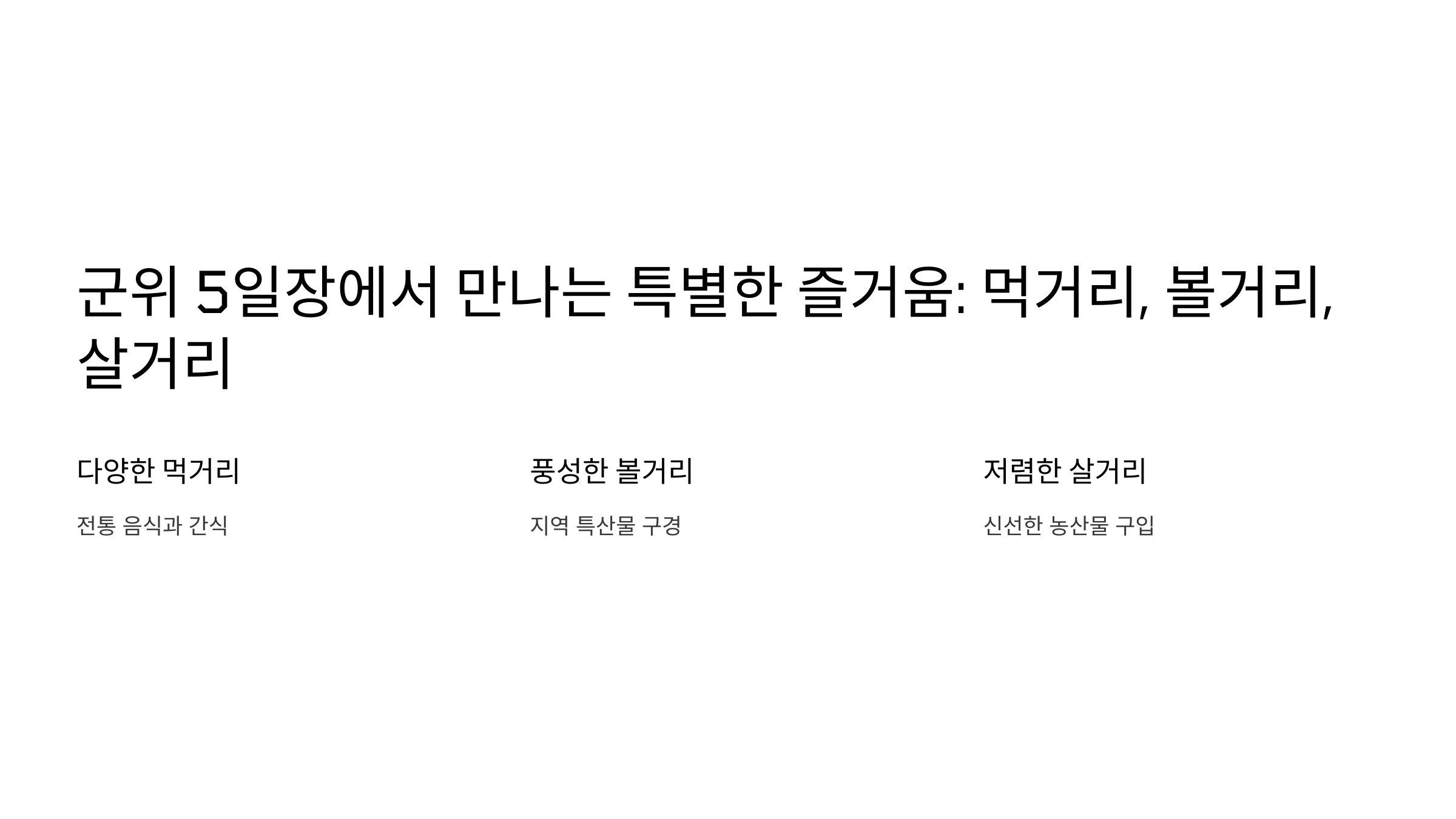 - 맛집 체크: 시장 내 유명 국밥집과 전통 떡집을 꼭 방문해 보세요!