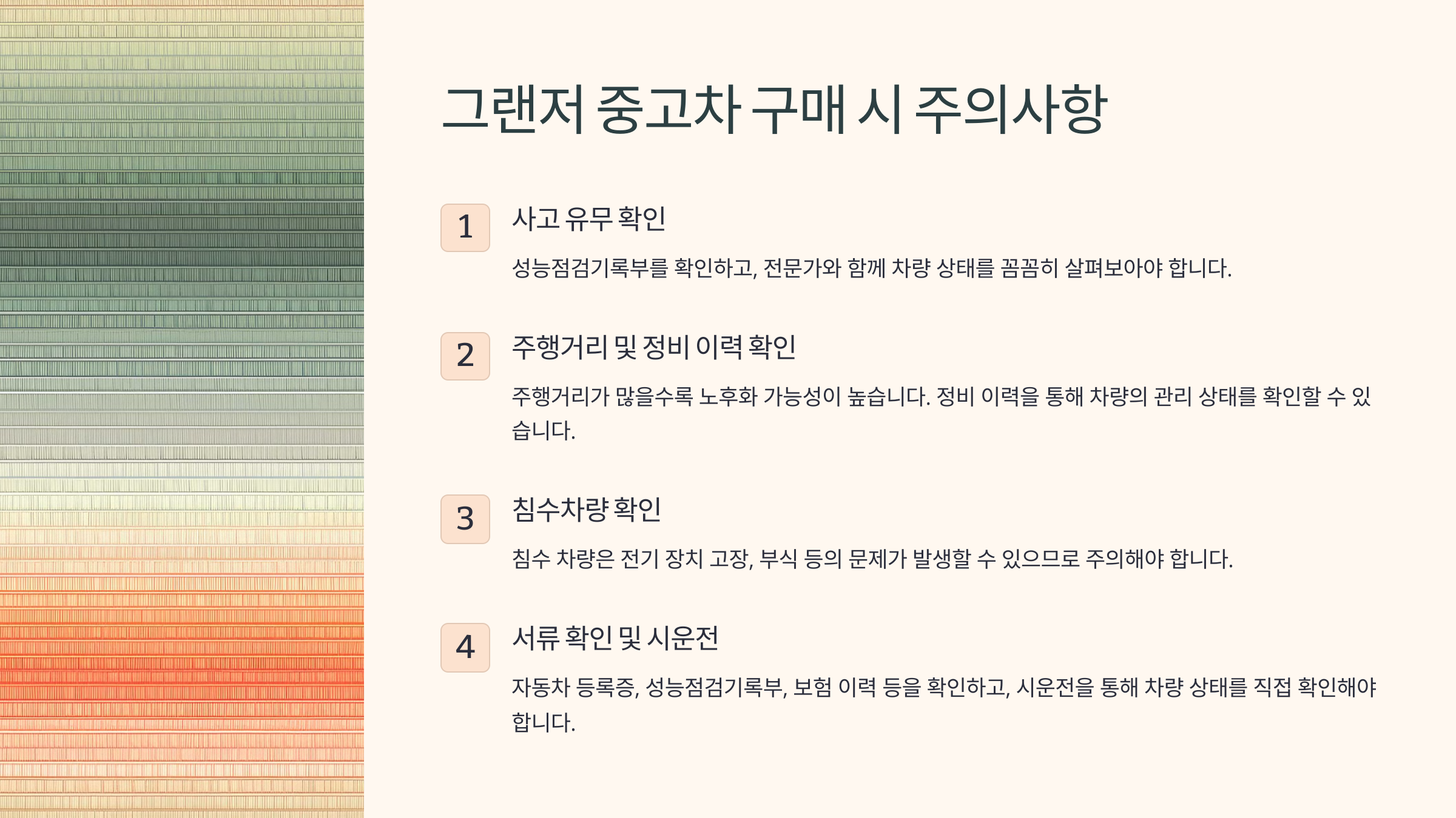 그랜저 중고차를 구매할 때는 다음과 같은 사항에 주의해야 합니다.