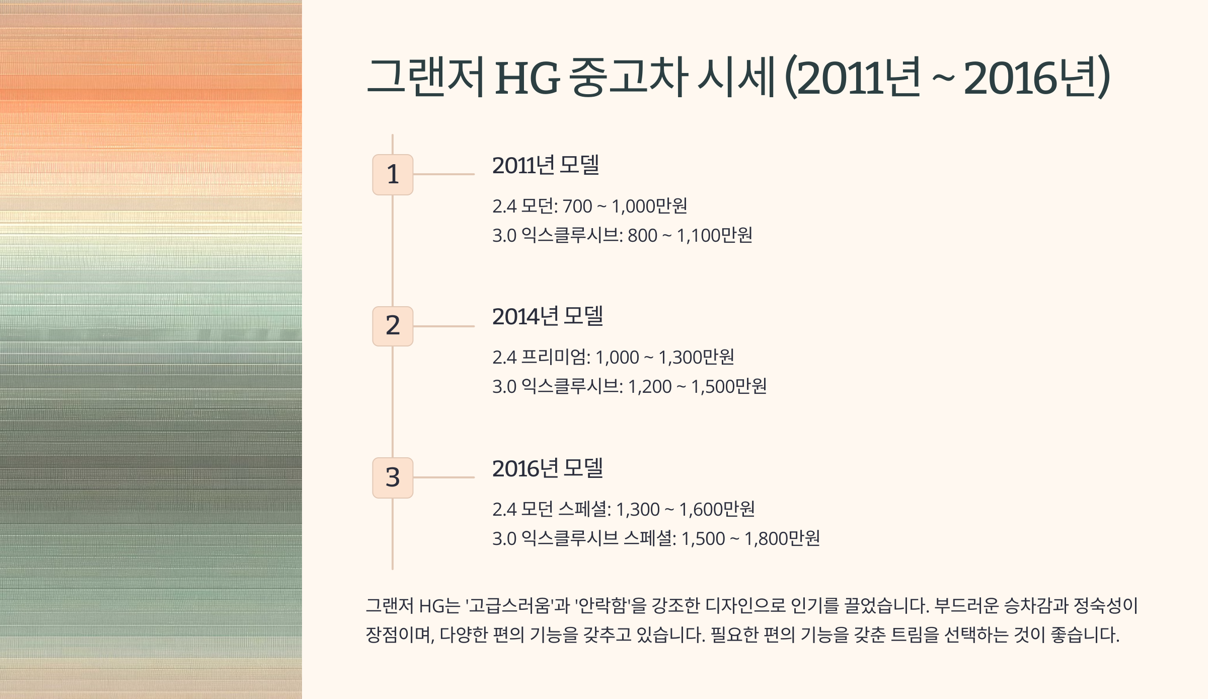 - 참고사항: 위 표는 일반적인 그랜저 중고 시세이며, 실제 거래 가격은 차량 상태, 옵션, 사고 유무 등에 따라 달라질 수 있습니다.