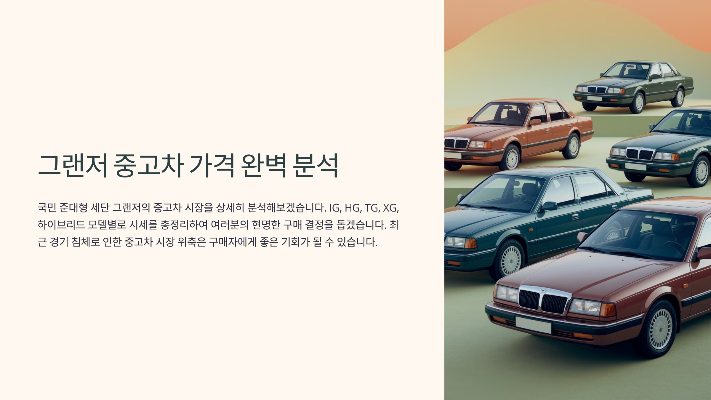 국민 준대형 세단, 그랜저는 오랜 역사만큼 다양한 모델과 트림을 자랑합니다. 합리적인 가격으로 그랜저를 소유하고 싶다면 중고차 시장이 좋은 선택지가 될 수 있습니다. 하지만 복잡한 중고차 시장에서 어떤 모델을, 얼마에 사야 할지 막막할 수 있습니다. 이 글에서는 그랜저 중고차 가격을 IG, HG, TG, XG, 하이브리드 모델별로 상세하게 분석하고, 연식별 그랜저 중고 시세를 총정리하여 여러분의 현명한 구매 결정을 돕겠습니다.