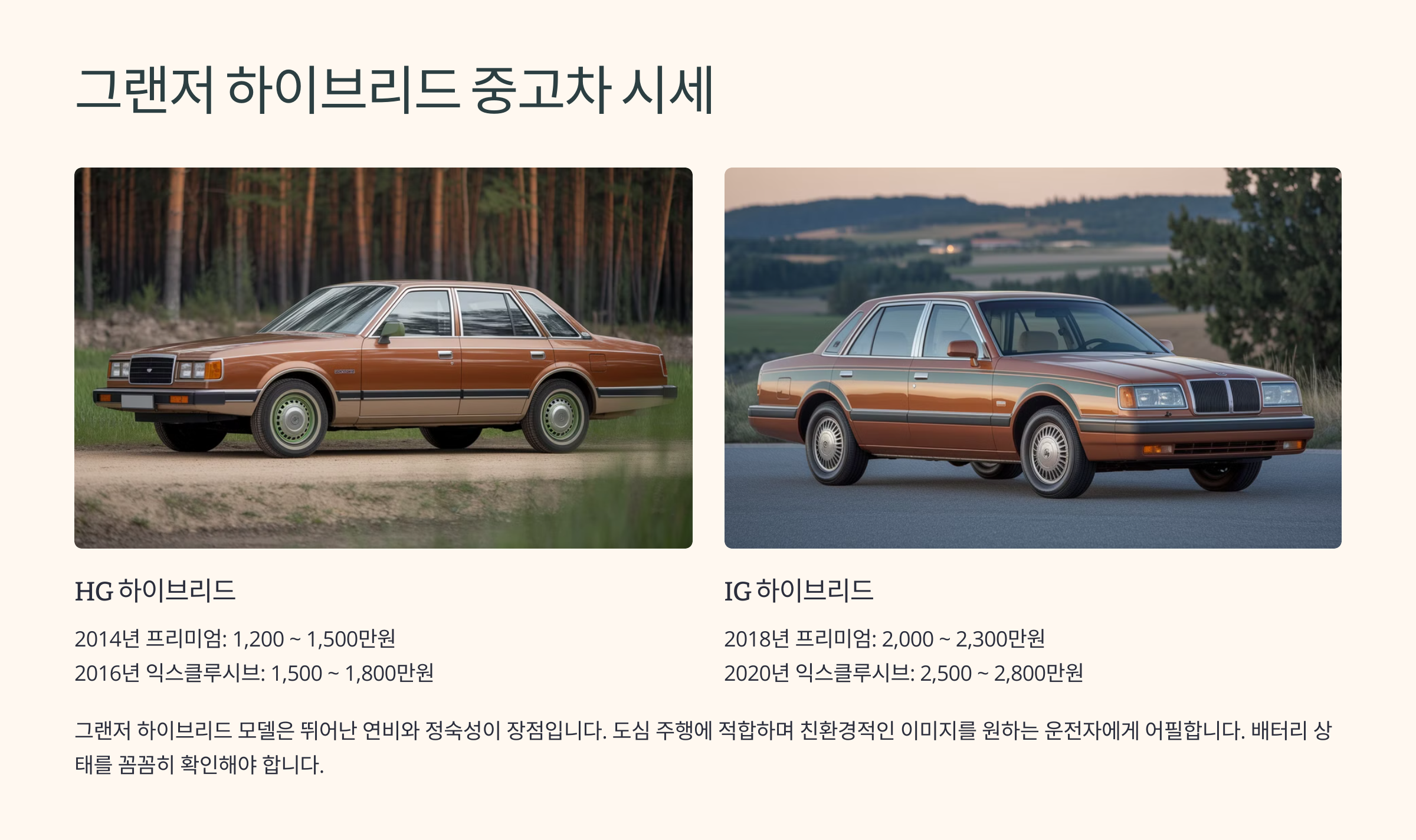 그랜저 하이브리드 모델은 일반 가솔린 모델에 비해 연비가 뛰어나 유지비 부담을 줄일 수 있습니다. 또한, 전기 모터의 힘을 빌려 초기 가속력이 우수하며, 정숙한 주행 환경을 제공합니다. 하이브리드 모델을 선택할 때는 배터리 상태를 꼼꼼히 확인해야 합니다.