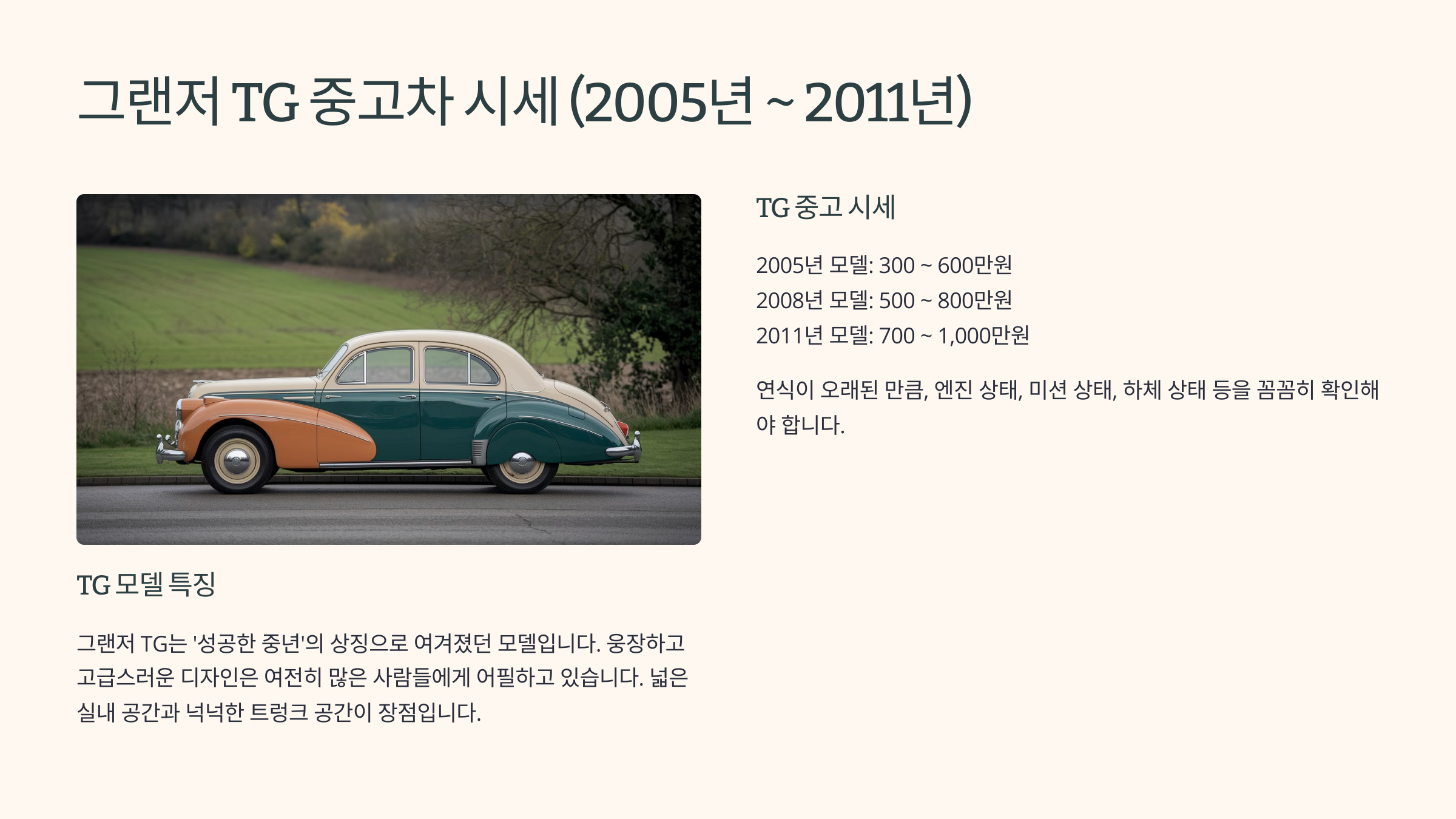 그랜저 TG는 2005년부터 2011년까지 생산된 모델로, '성공한 중년'의 상징으로 여겨졌던 모델입니다. 웅장하고 고급스러운 디자인은 여전히 많은 사람들에게 어필하고 있습니다. TG 모델의 그랜저 중고 가격은 연식, 트림, 주행거리에 따라 다음과 같은 시세를 형성하고 있습니다.