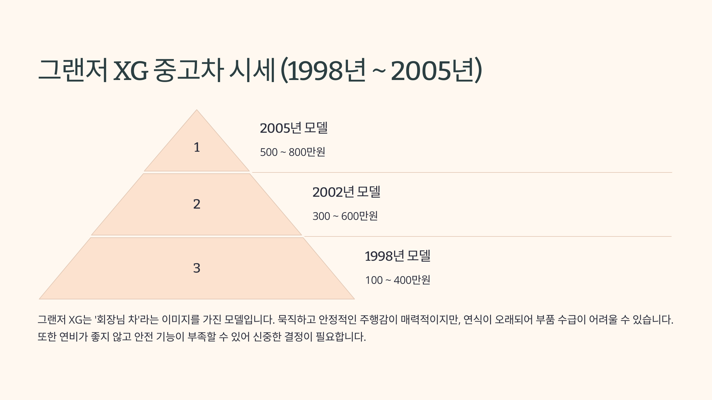 그랜저 XG는 연식이 오래된 모델인 만큼, 부품 수급이 어려울 수 있습니다. 또한, 연비가 좋지 않고, 안전 기능이 부족할 수 있습니다. 따라서, XG 모델을 구매할 때는 충분한 정보를 수집하고, 신중하게 결정해야 합니다.