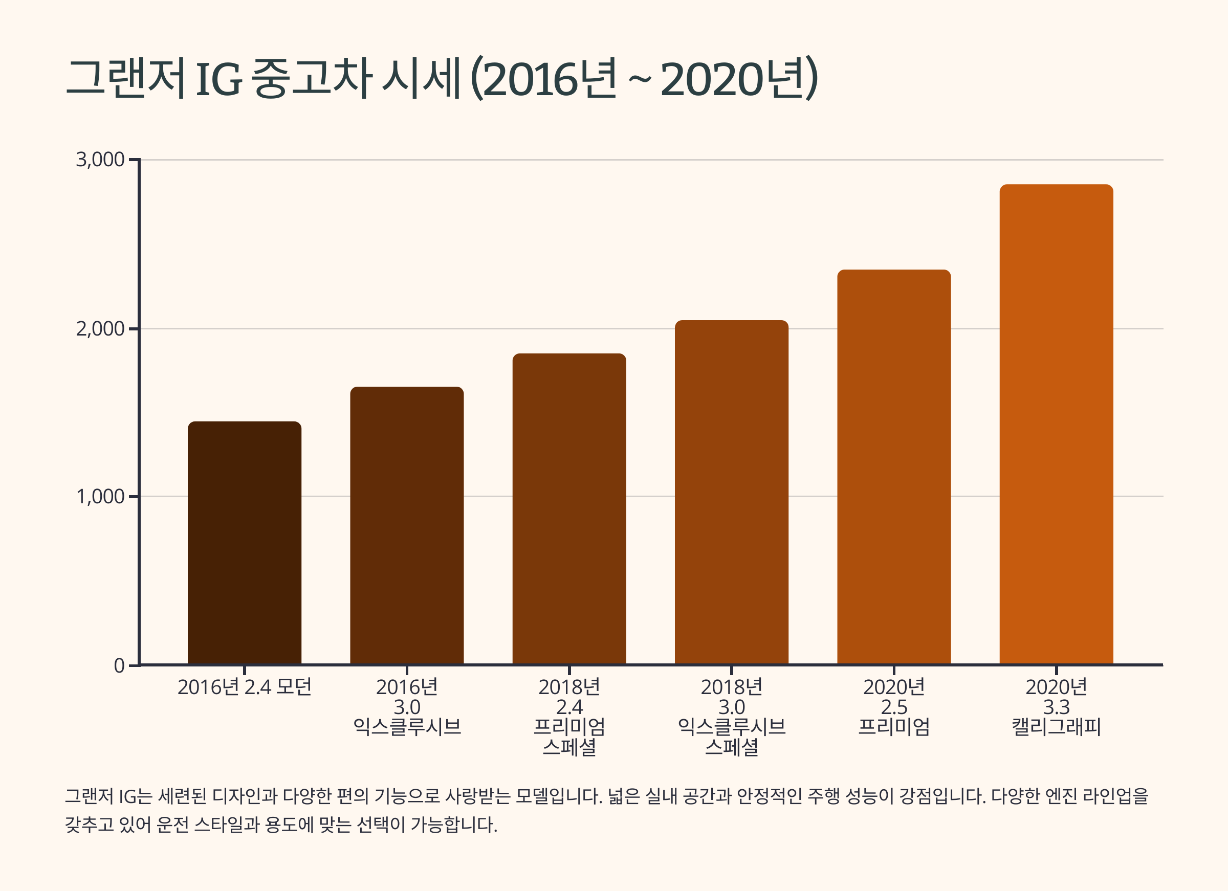 그랜저 IG는 2016년부터 2020년까지 생산된 모델로, 세련된 디자인과 다양한 편의 기능으로 많은 사랑을 받았습니다. 특히, 넓은 실내 공간과 안정적인 주행 성능은 패밀리 세단으로서의 강점을 보여줍니다. IG 모델의 그랜저 중고 가격은 연식, 트림, 주행거리에 따라 다음과 같은 시세를 형성하고 있습니다.