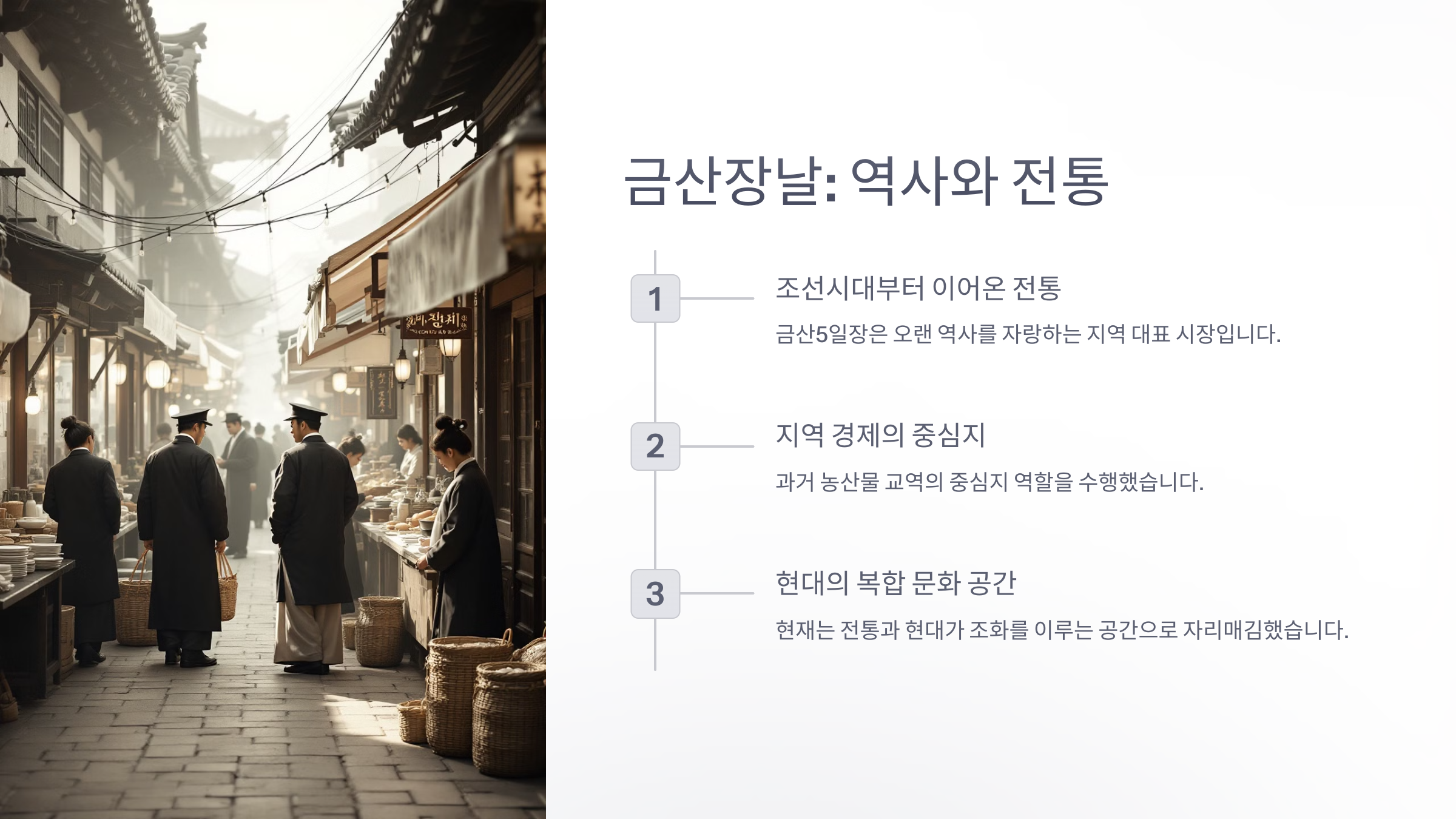 금산시장은 단순히 물건을 사고파는 장소를 넘어, 지역 주민들의 소통과 교류의 장으로서 중요한 역할을 수행합니다. 장날이면 어르신들은 옛이야기를 나누고, 젊은 세대는 새로운 문화를 접하며, 다양한 계층의 사람들이 어울려 살아가는 모습을 엿볼 수 있습니다. 금산시장은 금산군민들의 삶의 애환과 희망을 담고 있는 소중한 공간이며, 앞으로도 그 역사와 전통을 이어나갈 것입니다.