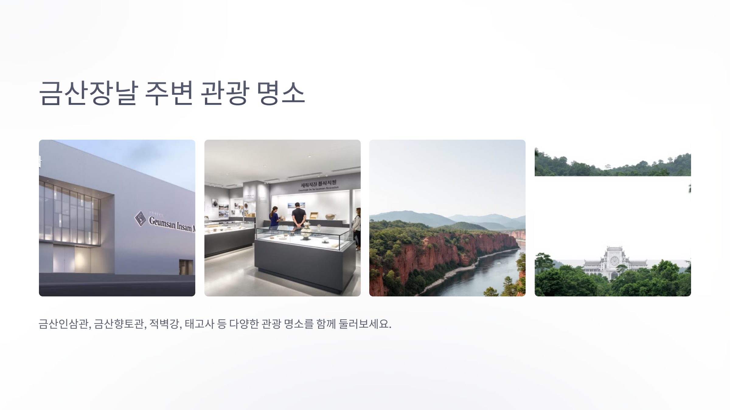 금산장날을 방문하는 김에 주변 관광 명소도 함께 둘러보면 더욱 풍성한 여행을 즐길 수 있습니다. 금산은 인삼의 고장답게 인삼과 관련된 명소들이 많으며, 아름다운 자연 경관을 자랑하는 곳들도 많습니다.