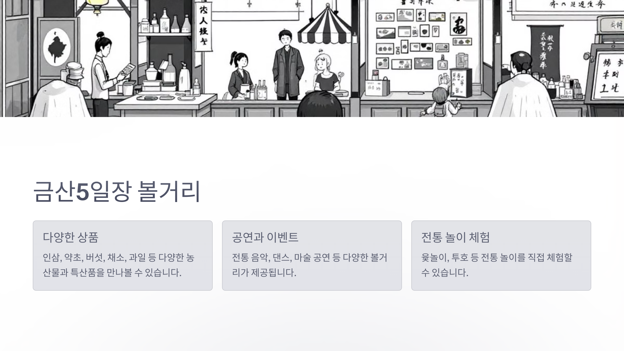금산5일장은 단순한 시장을 넘어, 금산의 문화를 체험할 수 있는 특별한 공간입니다. 장날에는 다양한 공연과 이벤트가 펼쳐지고, 전통 놀이를 체험할 수 있는 기회도 제공됩니다. 또한, 금산의 역사와 문화를 알아볼 수 있는 전시회도 개최되어, 금산5일장을 방문하는 모든 사람들이 즐거운 시간을 보낼 수 있습니다.