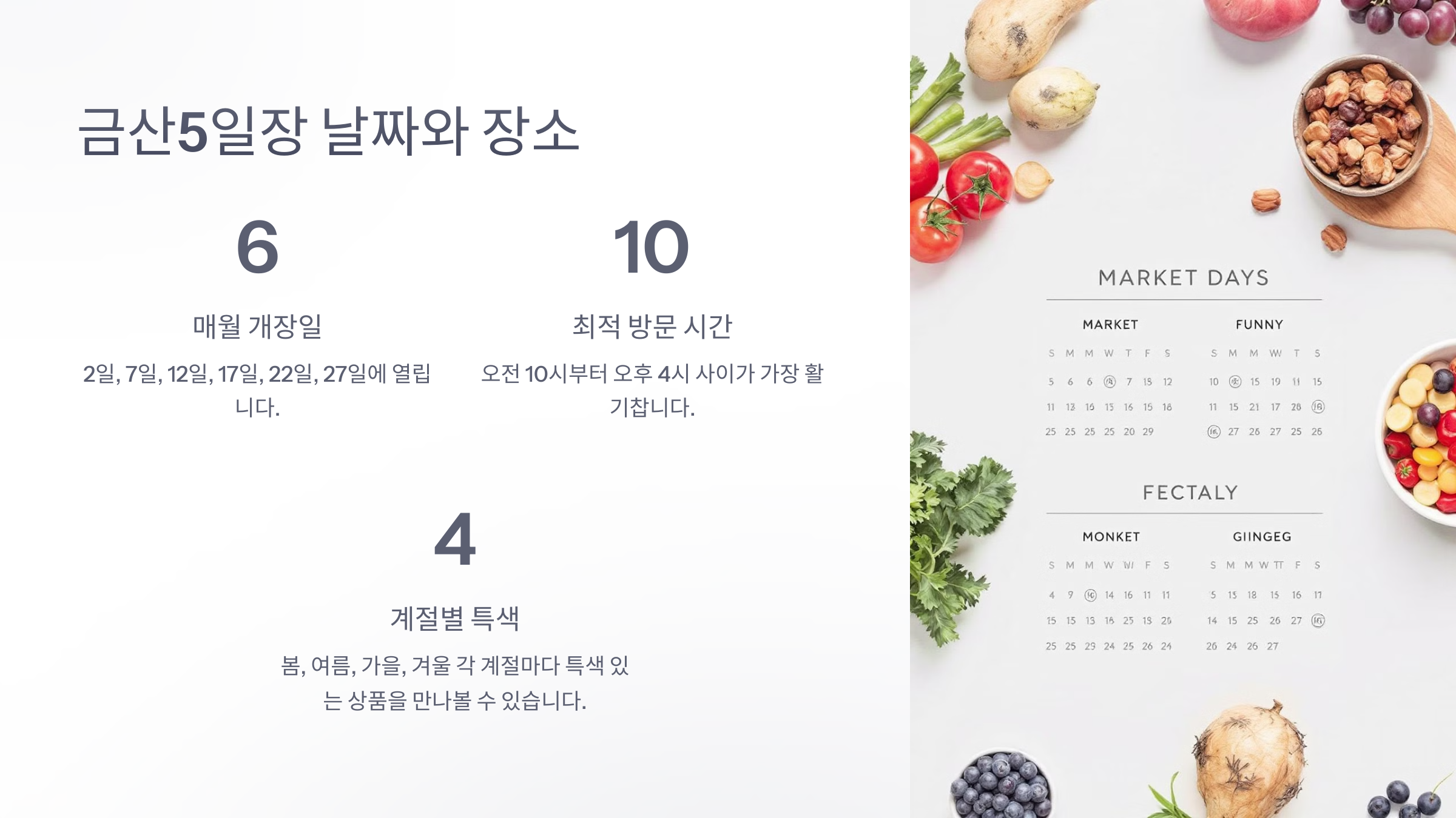 금산5일장은 계절에 따라 판매하는 물품이 조금씩 달라집니다. 봄에는 봄나물, 여름에는 제철 과일, 가을에는 햇곡식, 겨울에는 김장 재료 등 계절에 맞는 다양한 상품들을 만나볼 수 있습니다. 특히, 금산은 인삼으로 유명하기 때문에, 금산5일장에서는 사계절 내내 품질 좋은 인삼을 저렴하게 구매할 수 있습니다.
