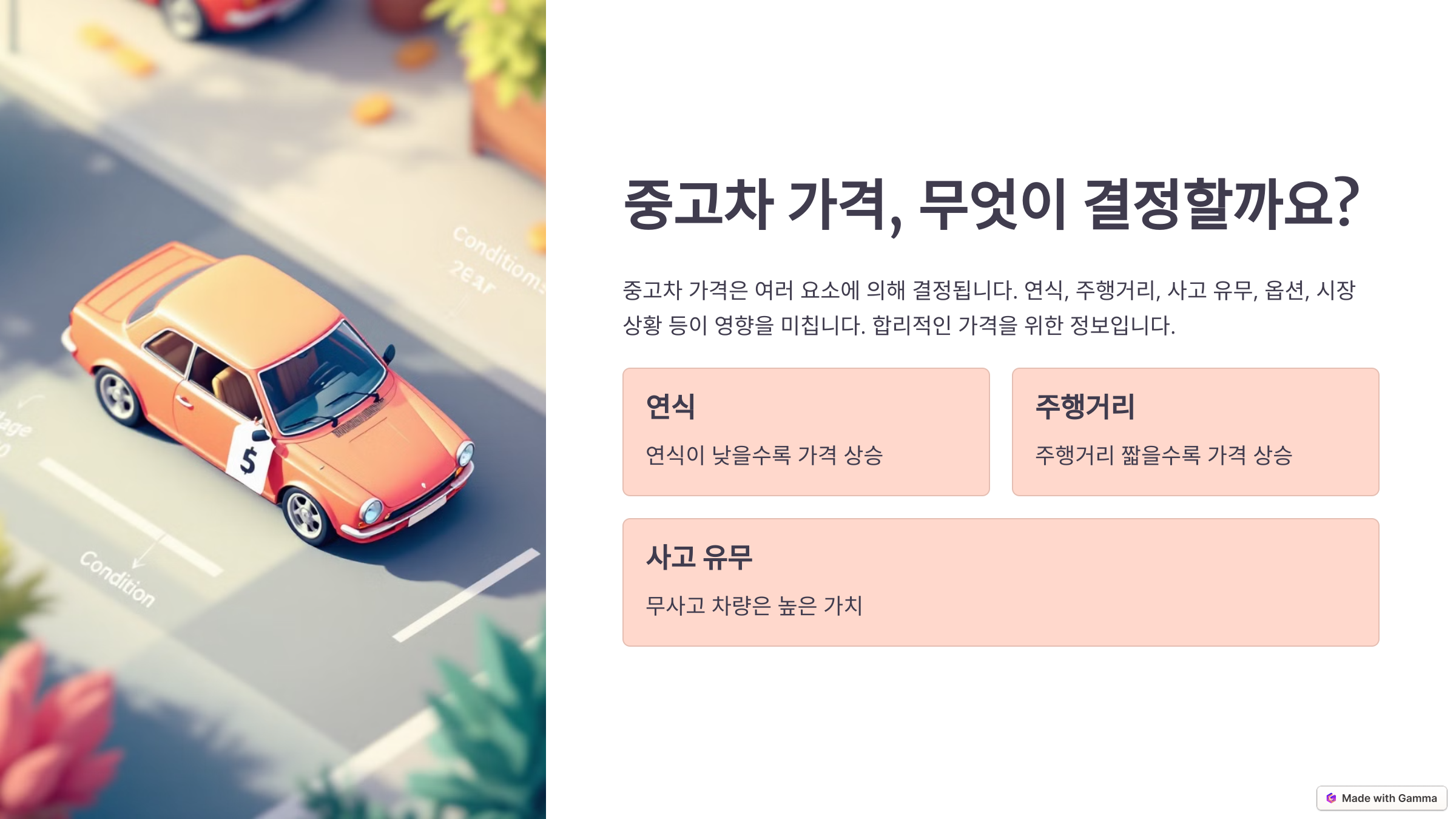 ✅ 차량 상태 및 사고 이력: 무사고 차량이 높은 가치를 가지며, 사고 이력이 있으면 가격이 하락하는 경향이 있어요. 특히 프레임(뼈대) 손상이 있는 차량은 감가가 커요.