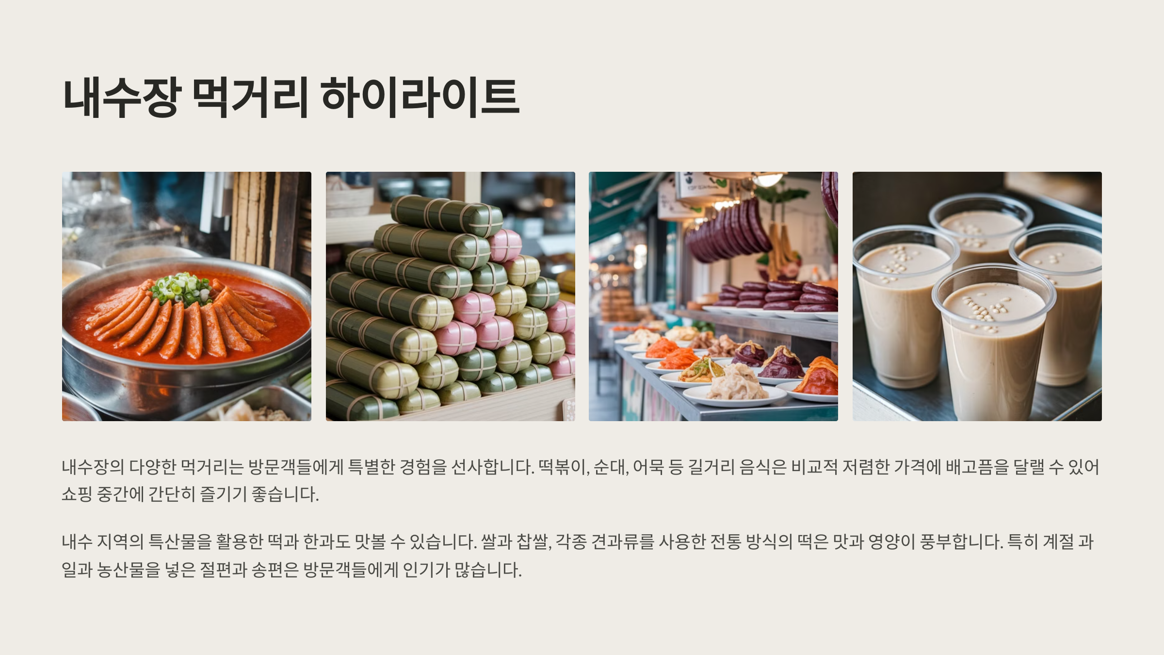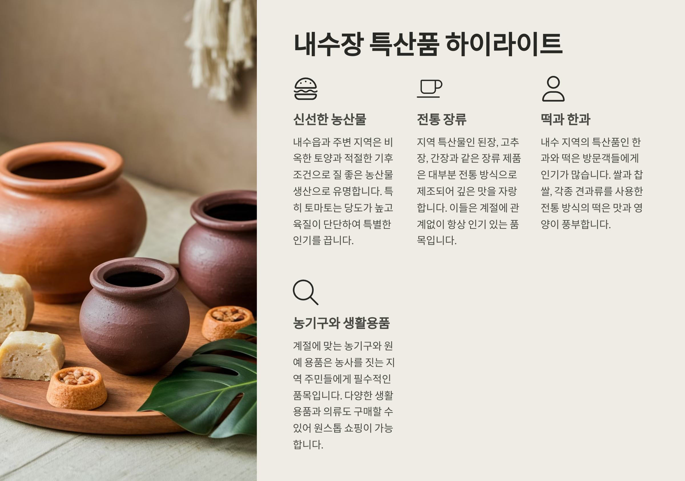 - 내수장날의 대표 먹거리: 손두부, 들기름 빈대떡, 전통 떡과 한과
