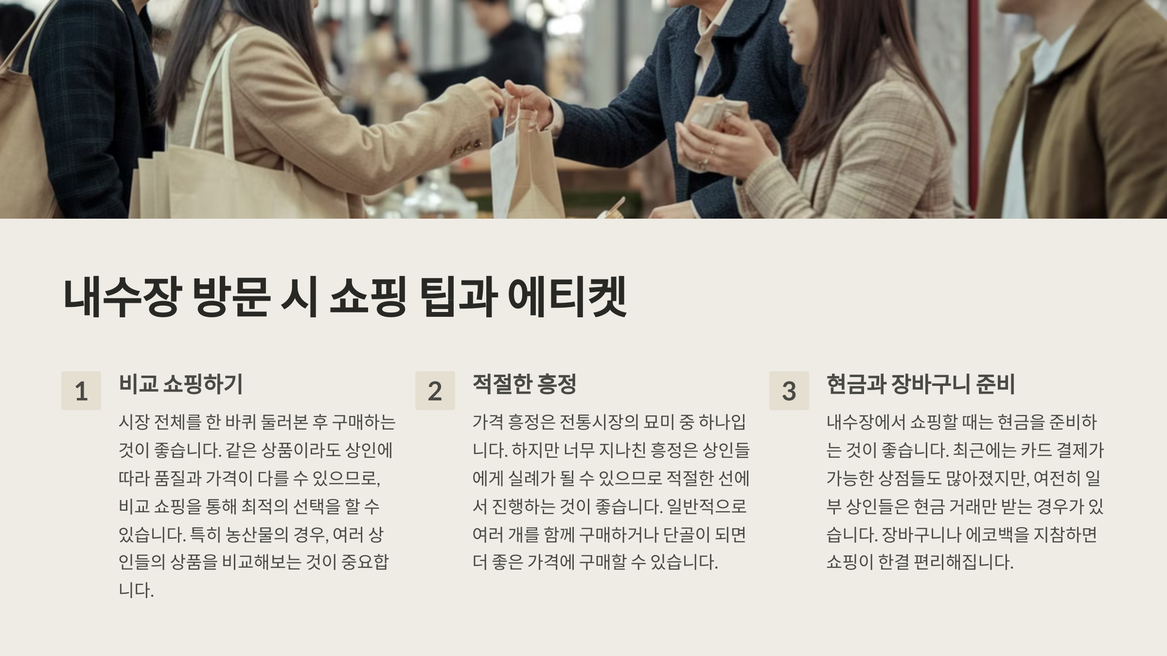 내수장날을 더욱 알차게 즐기기 위한 쇼핑 팁과 에티켓을 알아보겠습니다. 전통시장에서의 쇼핑은 대형마트와는 다른 재미와 매력이 있지만, 몇 가지 알아두면 좋은 정보들이 있습니다.